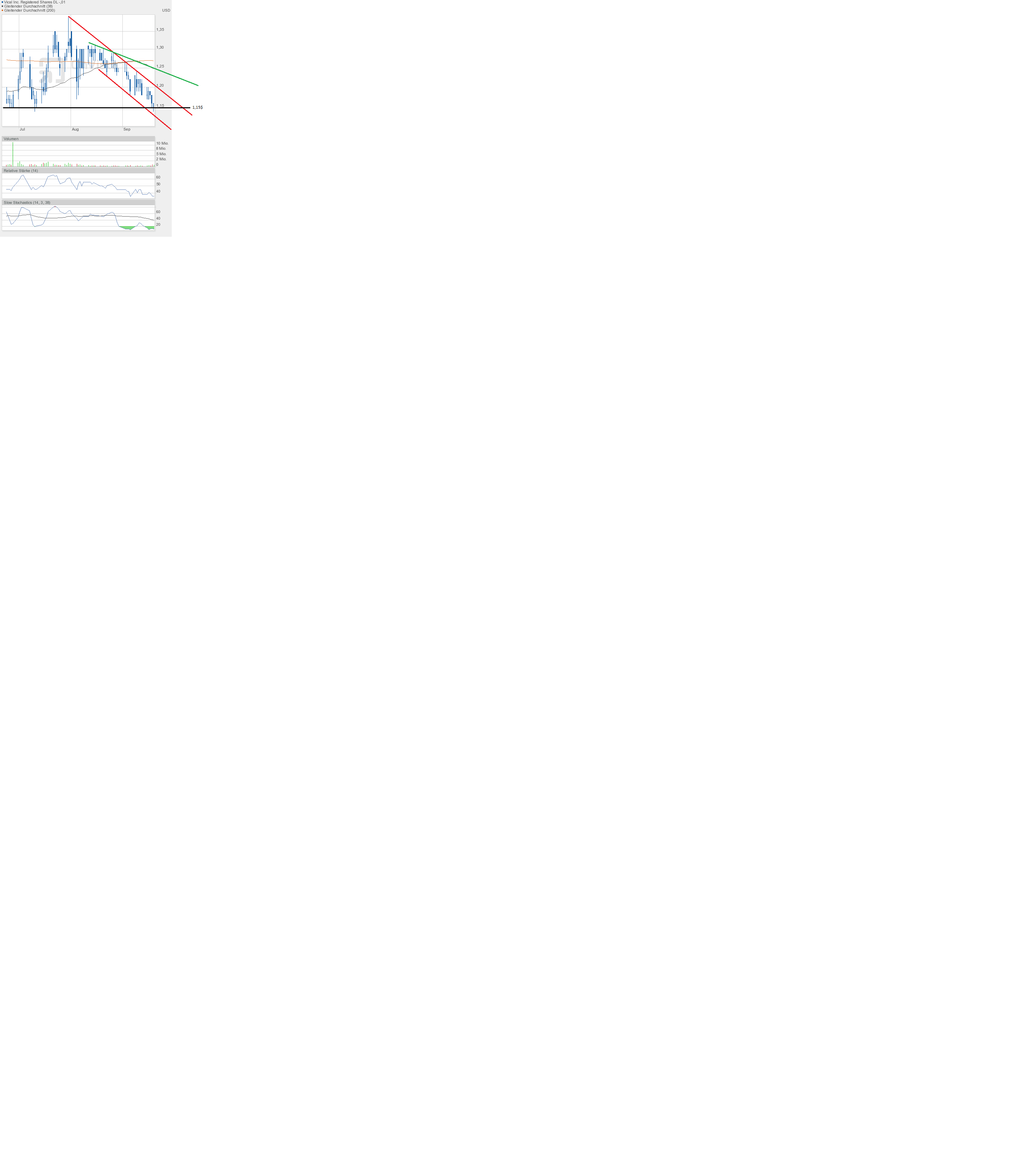 ... Und auf einmal waren alle Aufwärtstrendlinien zerstört. Jetzt zählen nur noch Querlinien. Die erste ist bei 1,18$ bereits genutzt worden. Hier befindet sich eine Kreuzunterstützung. Das war aber vorher nicht bekannt, sondern nur, weil sich mit dem gestrigen Tag der schwarze Abwärtstrendkanal genau definieren lässt. Die obere schwarze Abwärtstrendlinie war ja schon existent. Aber wo legt man die untere an. Nun ist es klar.