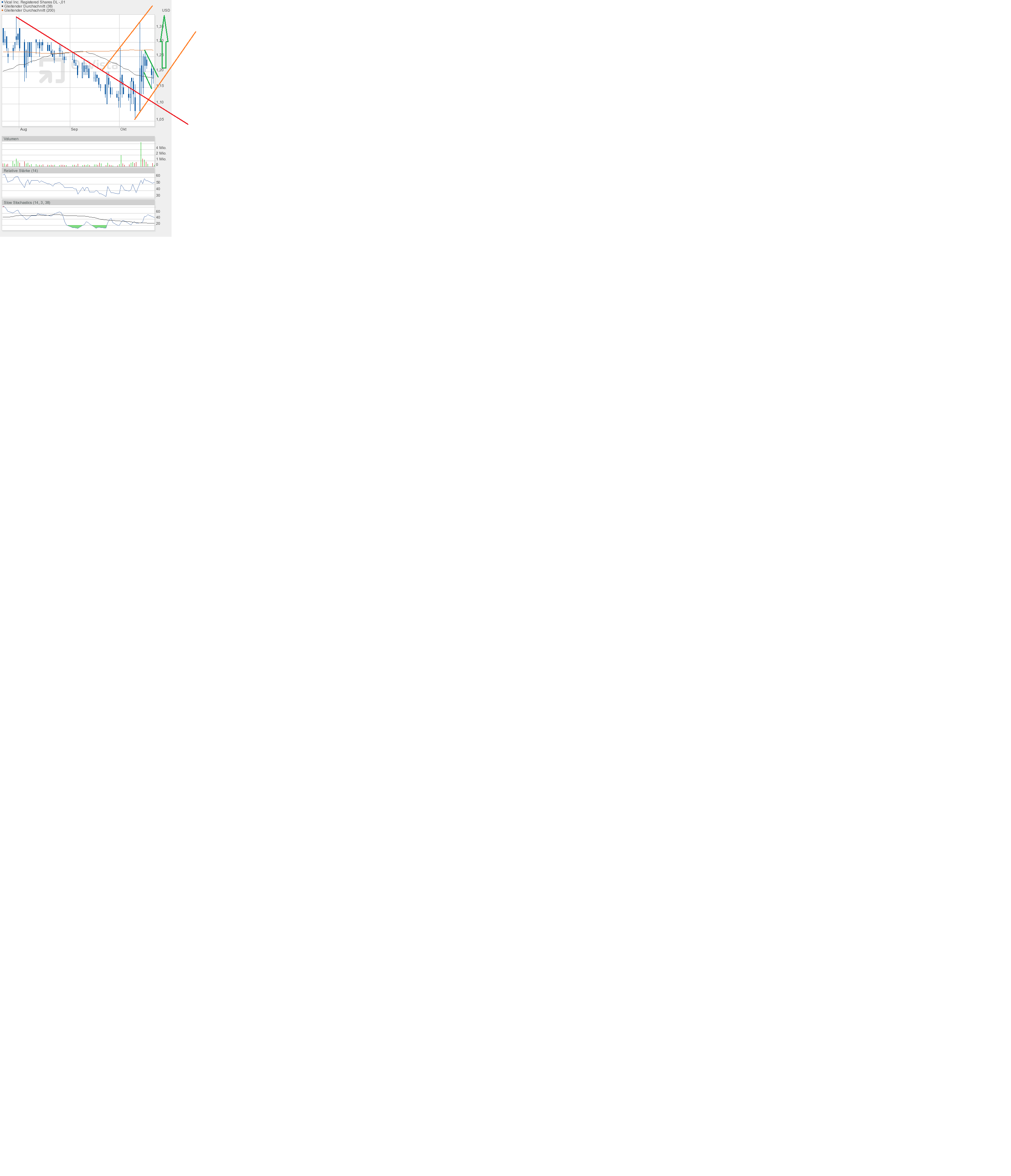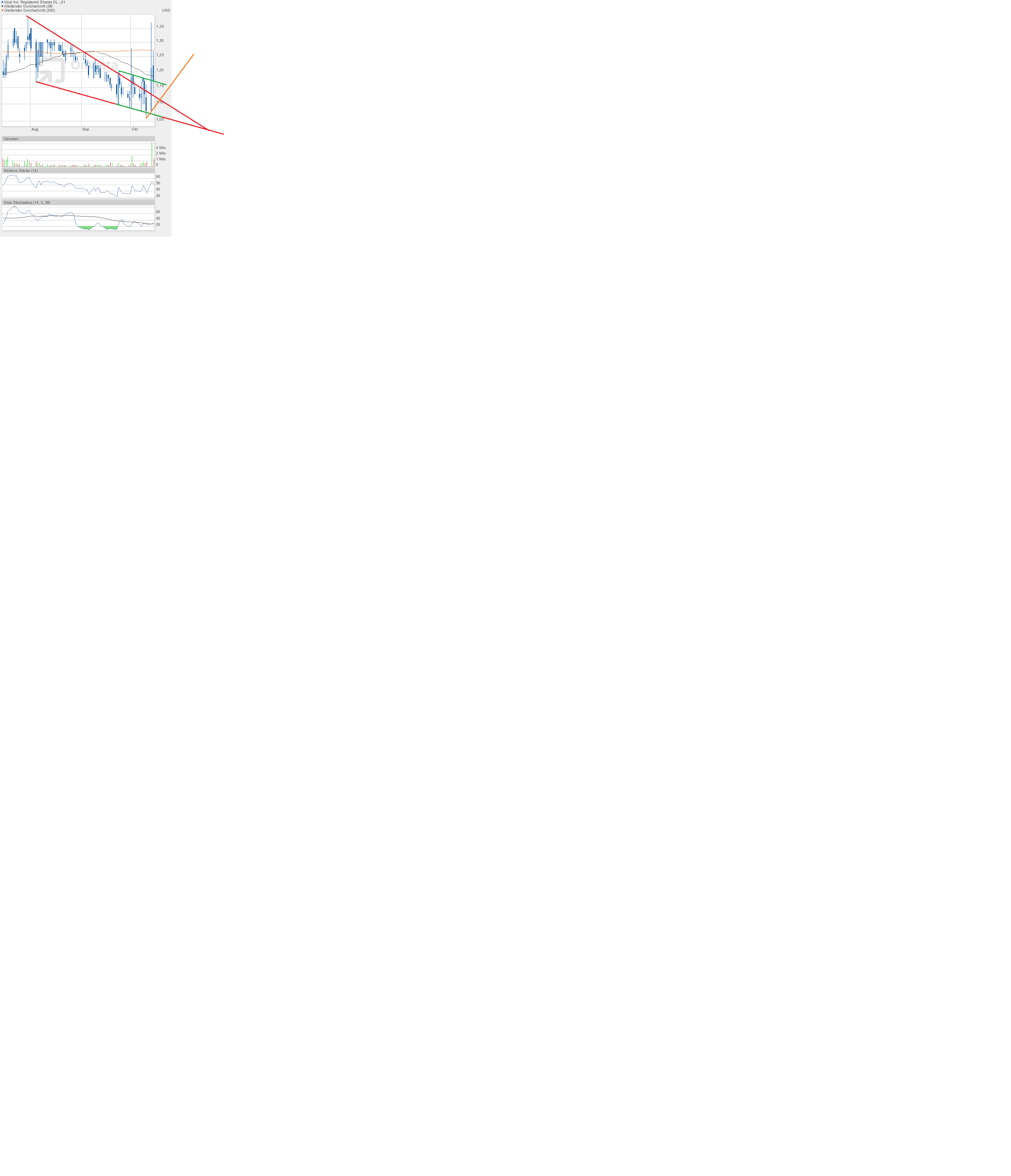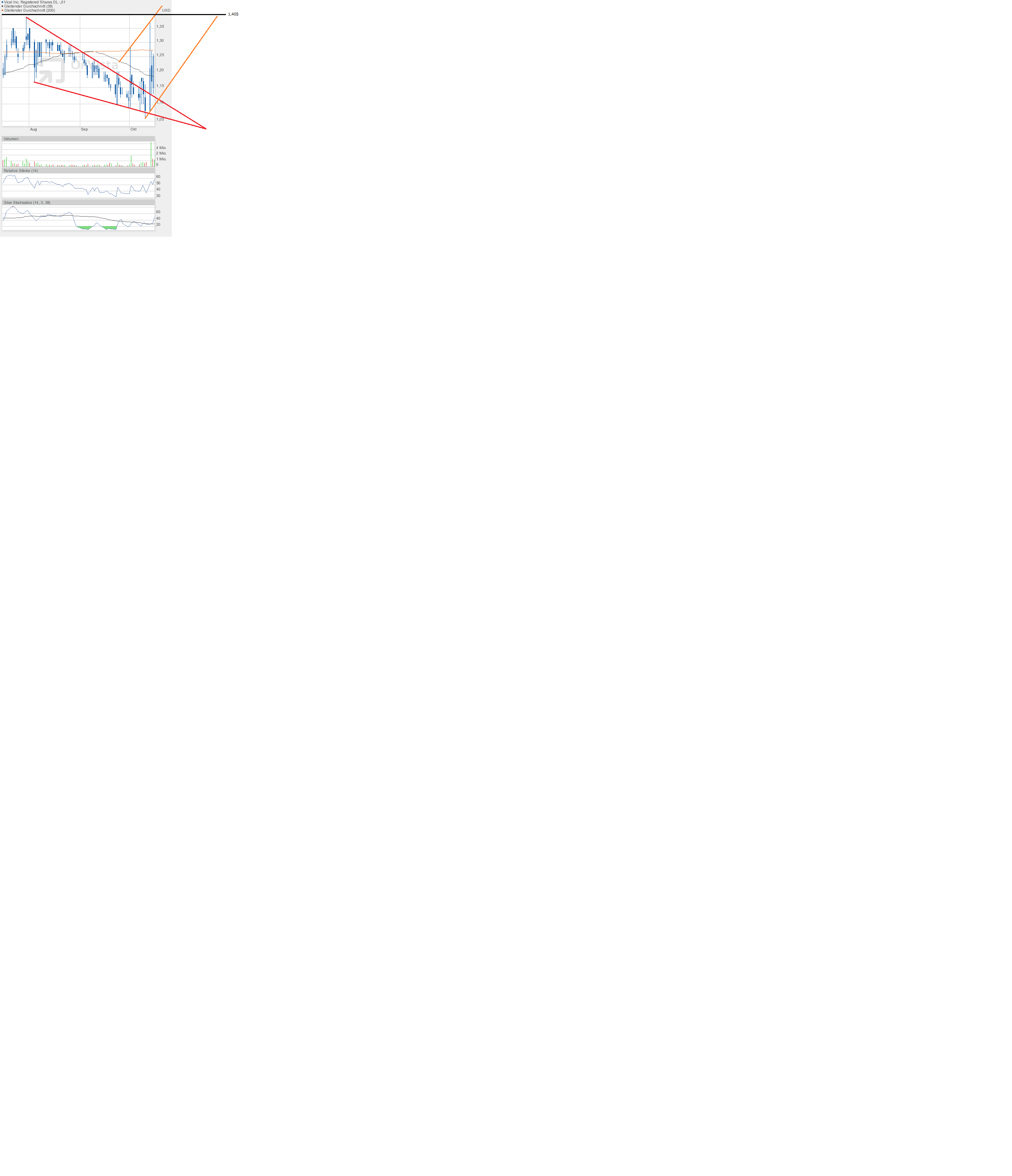 Darüber hinaus wurde nicht nur der rote Keil verlassen, sondern auch der grüne Abwärtstrendkanal nach oben durchbrochen. Das ist eigentlich ein gutes Zeichen sein, was einen erneuten Anstieg bis zunächst 1,40$ erwarten ließe.