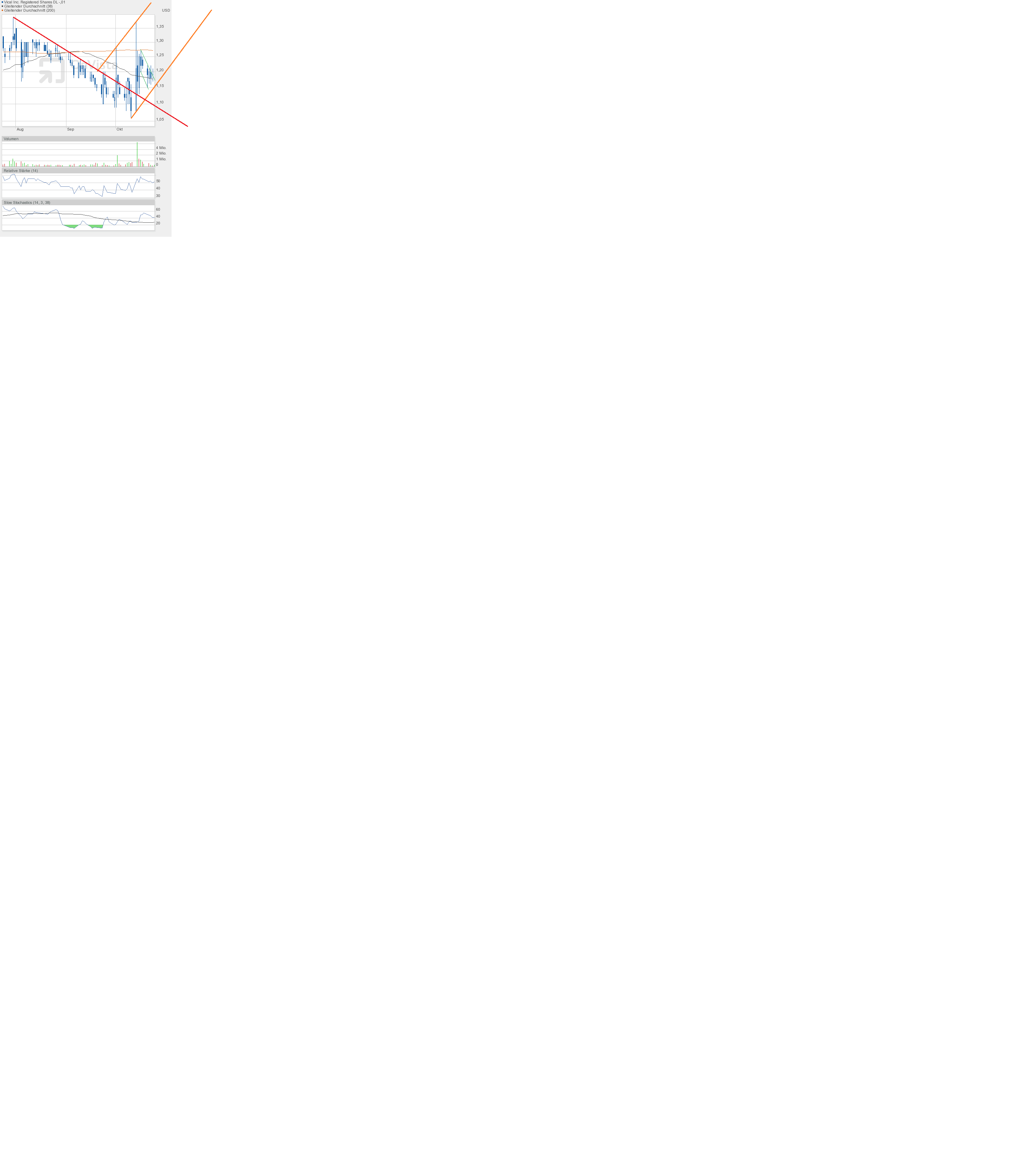 Charttechnisch hat der Montag bei Vical deutliche Spuren hinterlassen. Mit dem Tageshoch von 1,37$ machte die Aktie erst nahe meiner bekannt ausgemachten Schlüsselmarke bei 1,40$ halt. Ich hatte ja vor wenigen Stunden noch eher Skepsis an den Tag gelegt, ob wir zum Schluss nicht wieder mit leeren Händen da stehen könnten. In der Tat kam es wieder zu einem recht zügigen Abverkauf, der bei 1,16$ endete. Da war die Enttäuschung schon groß. Nachdem die Börsen dann aber weiter abtauchten und Vical dann doch noch mit 1,21$ und einem Mega-Volumen von 5,3Mio Aktien aus dem Handel ging, geht der Tag doch sehr in Ordnung.