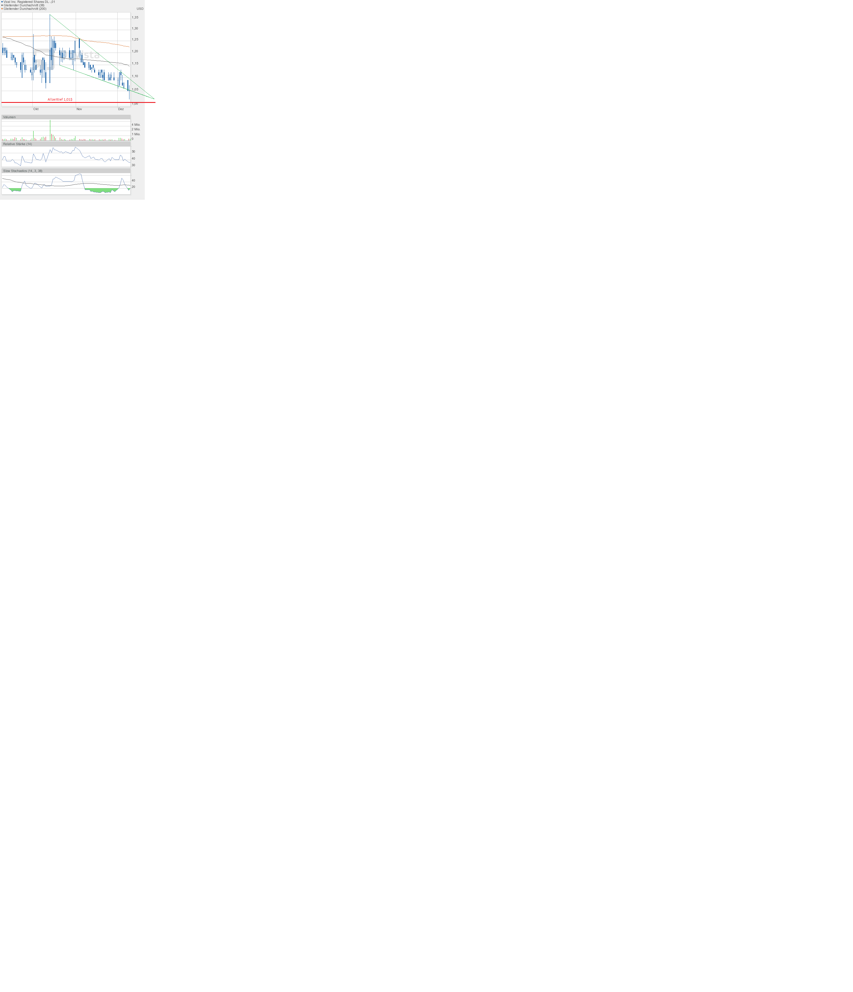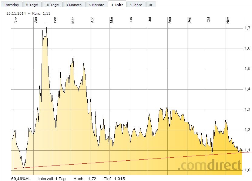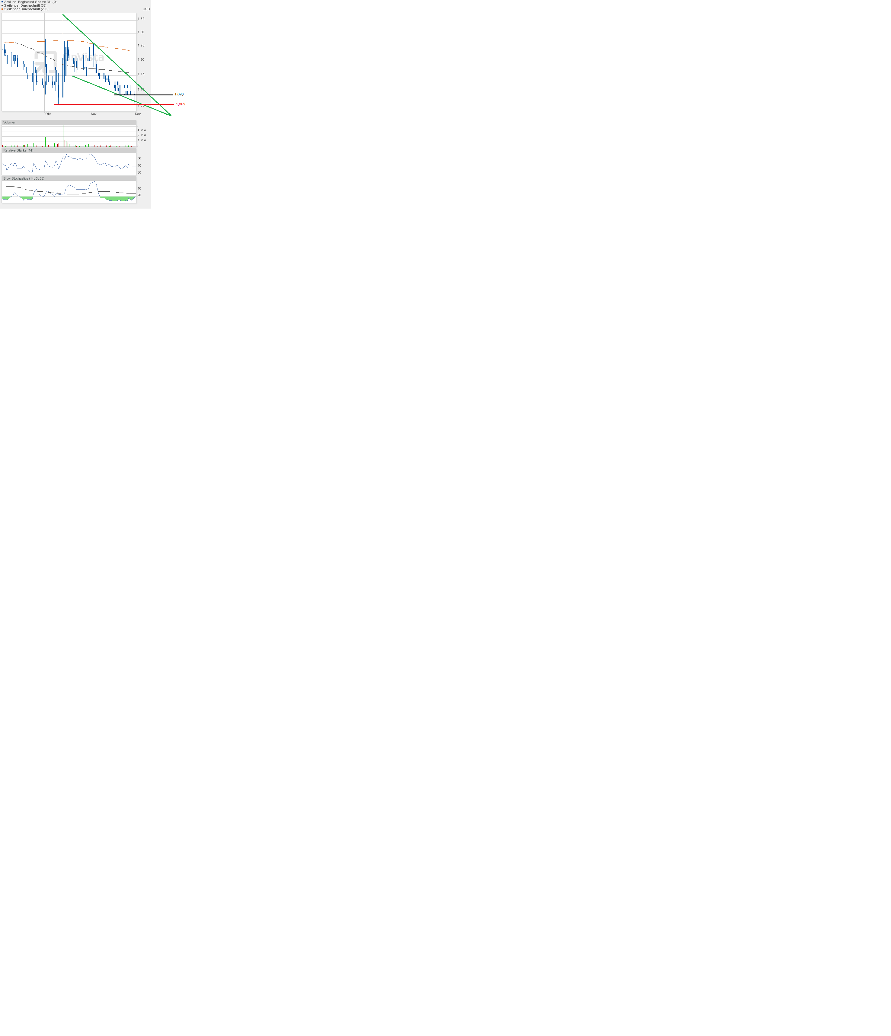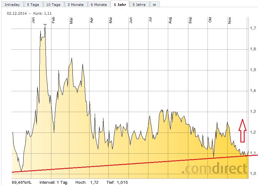 Um bis zur 1,40$ zu gelangen, muss die 200-Tage-Linie überwunden werden. Das war am Montag nicht gelungen. Exakt an dieser Durchschnittslinie war Schluss nach oben. Der Aufwärtstrendkanal konnte aber noch gerettet werden.