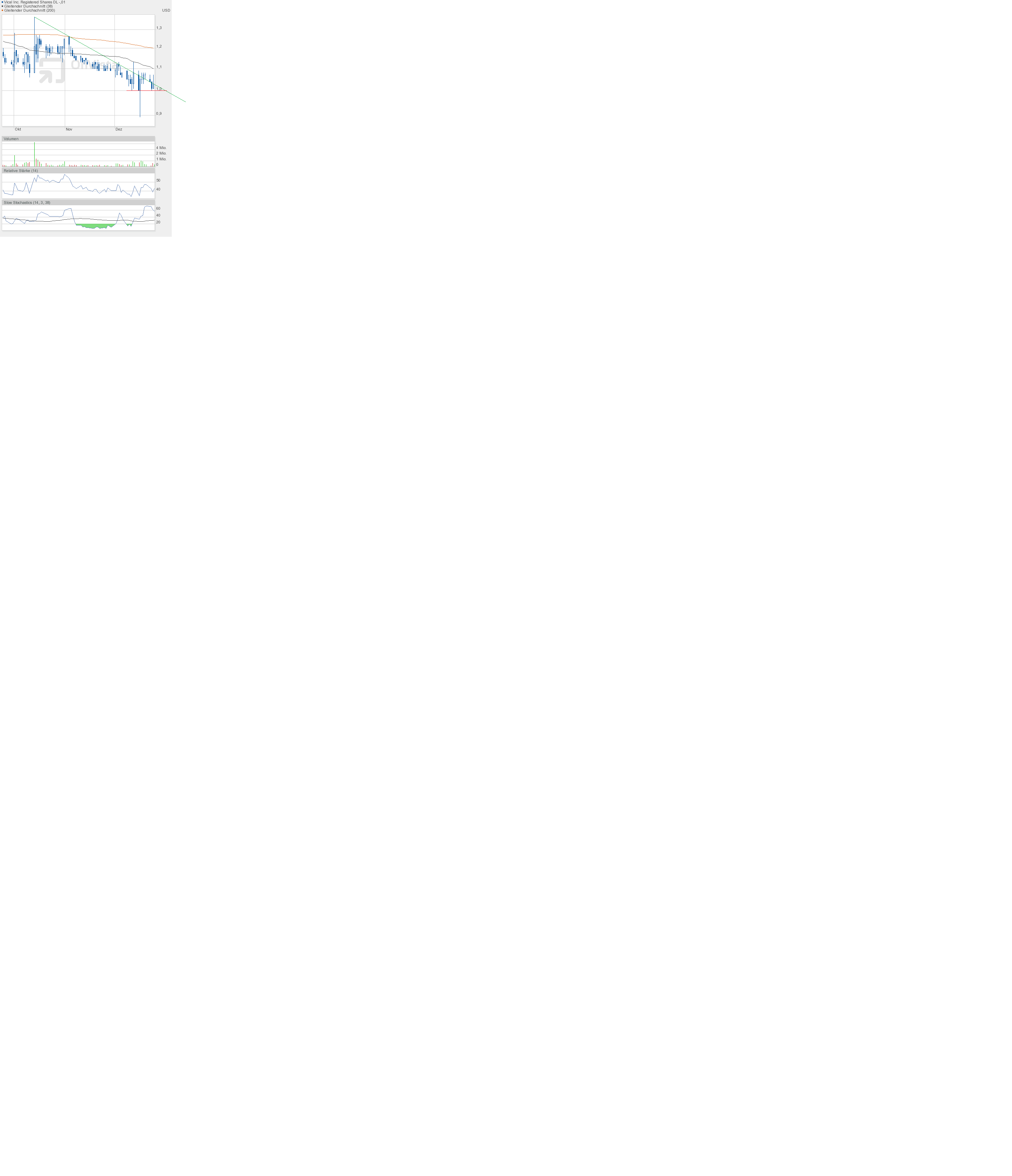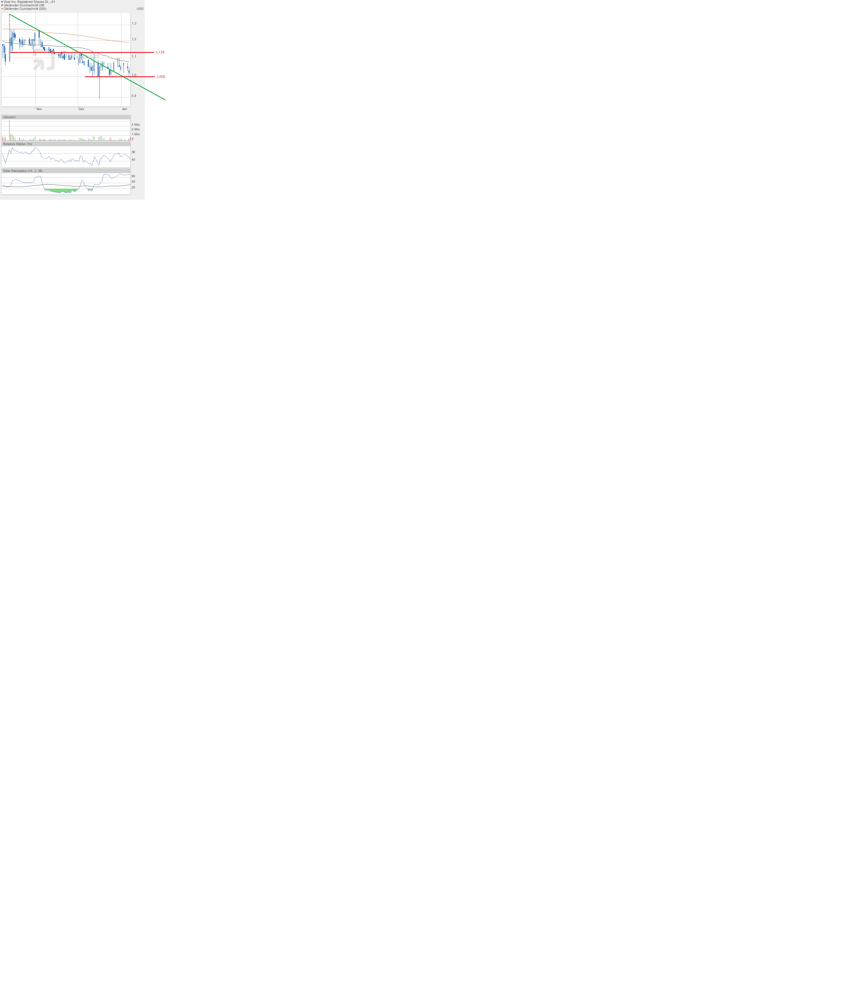 Das war ein gigantischer Rebound von 0,89$ bis auf 1,06$ mit hohem Volumen, Schlusskurs 1,05$. Damit ist die 1-Dollar-Marke bestätigt worden. Aber was viel, viel wichtiger ist, der Sprung über die grüne Abwärtstrendlinie bleibt doch noch im Bereich des Möglichen. Wer hätte das kurz nach Handelsbeginn gedacht. Ich jedenfalls nicht.