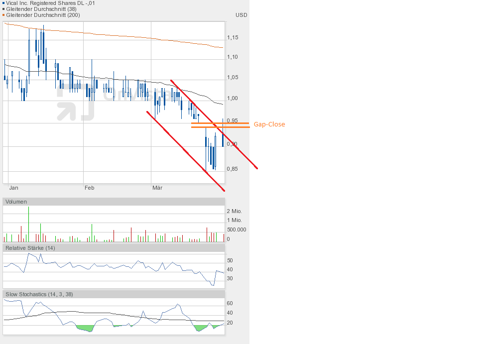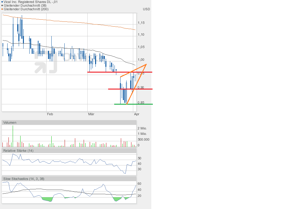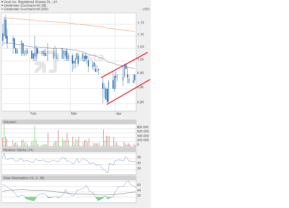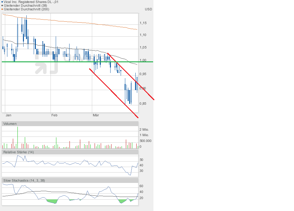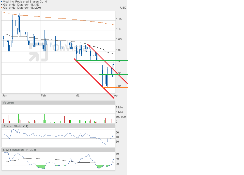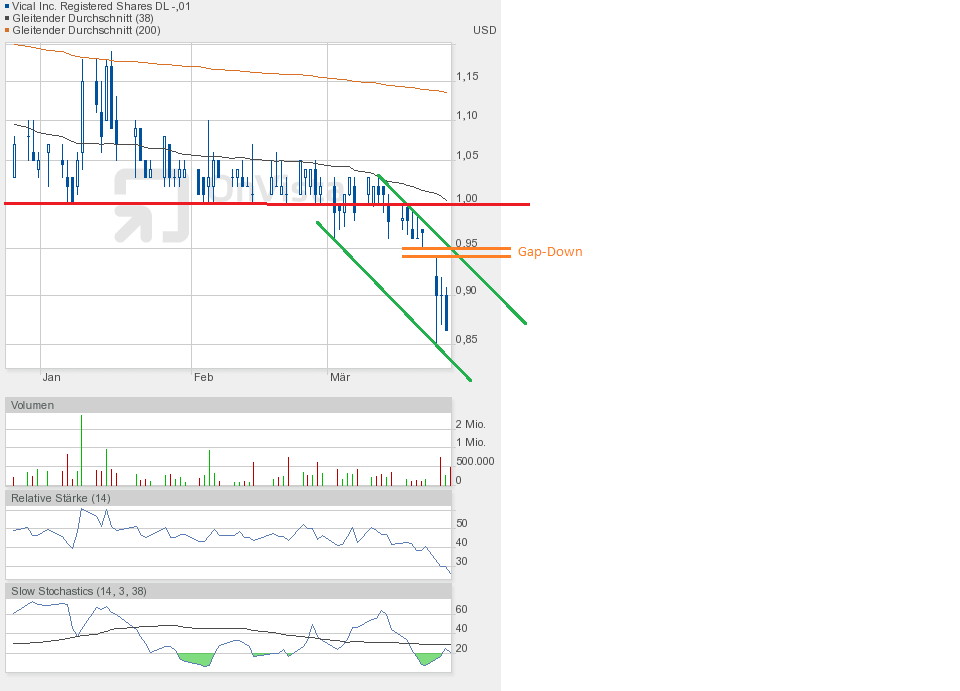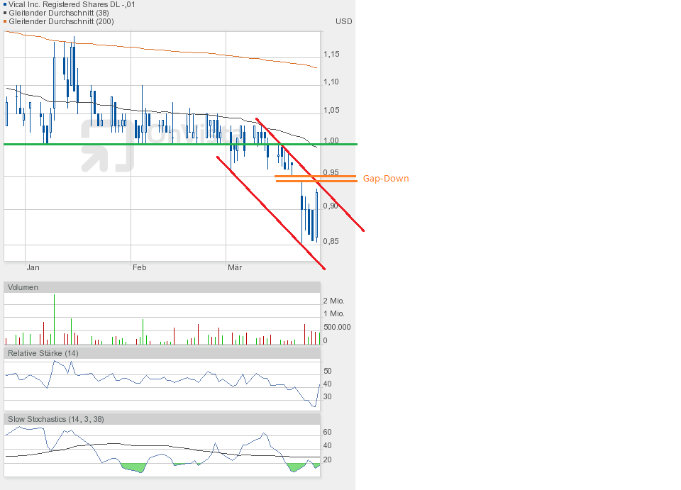 Gestern jedenfalls ging es weiter runter. Die Unterstützung bei 0,90$ ist gefallen. Schlusskurs 0,86$. Dem Chartbild entnehmend befindet sich die Aktie in dem grünen Abwärtstrendkanal. Besserung gibt es weiterhin erst oberhalb 0,95$.