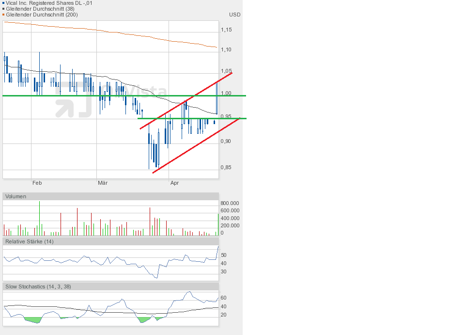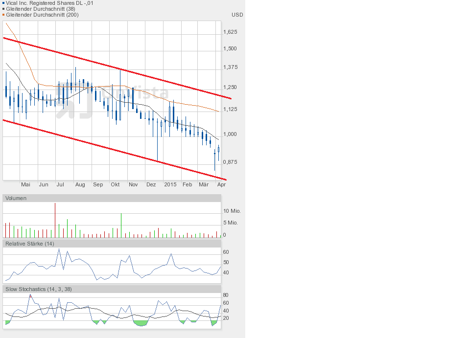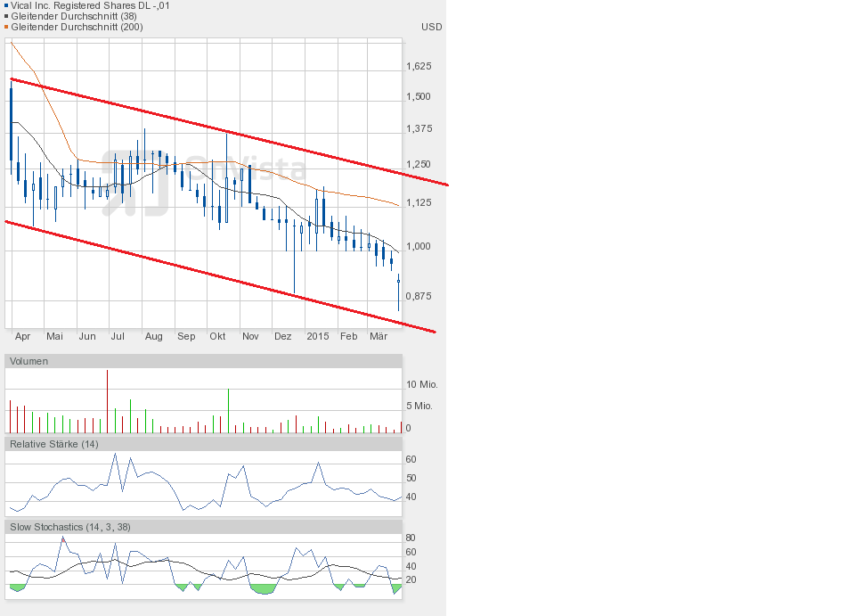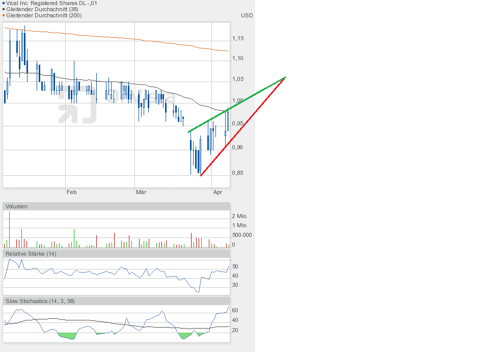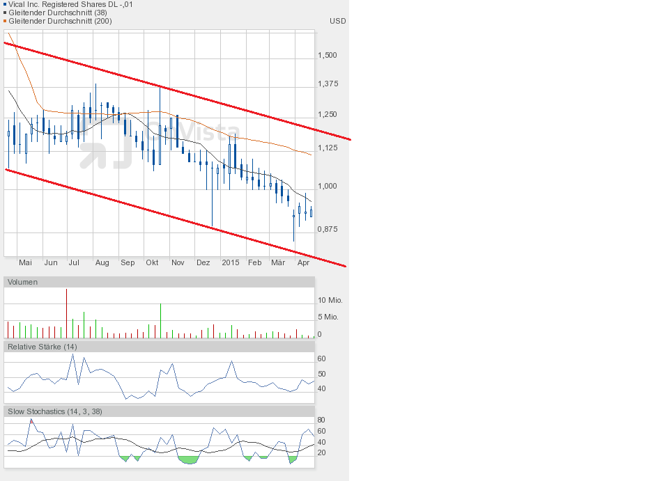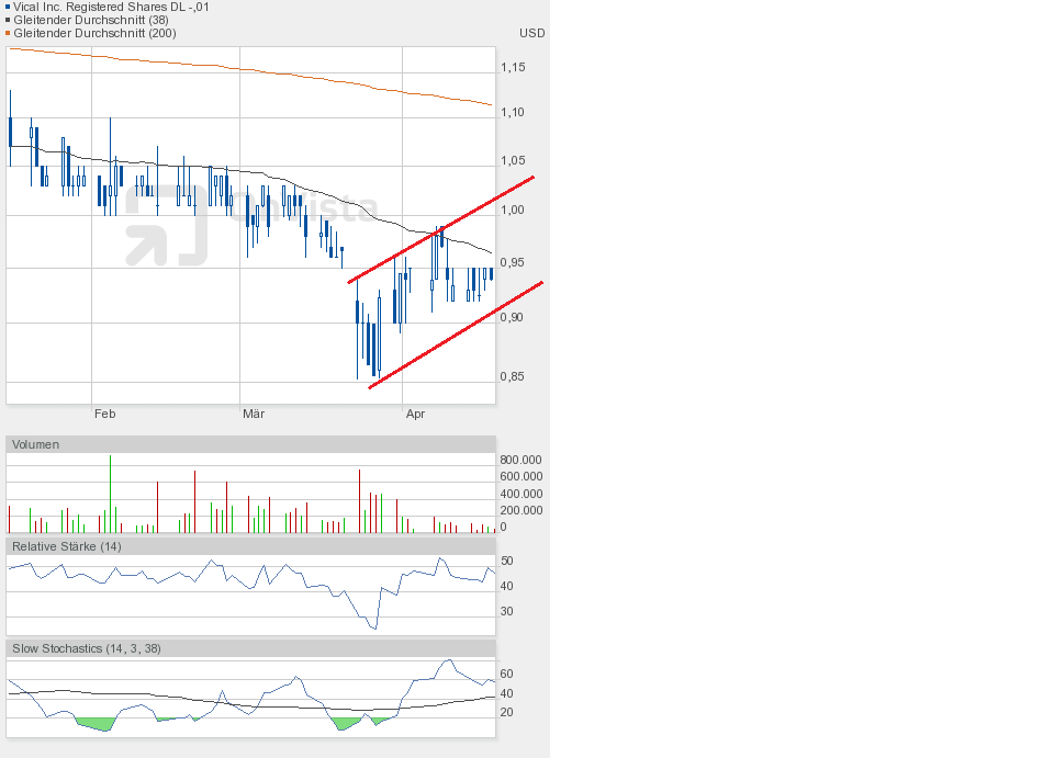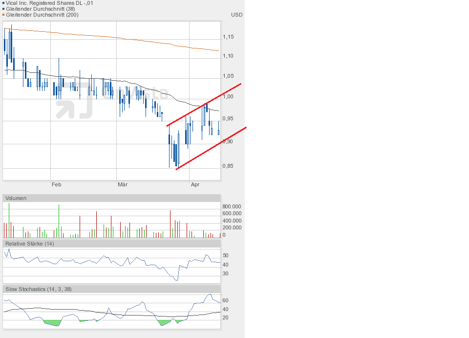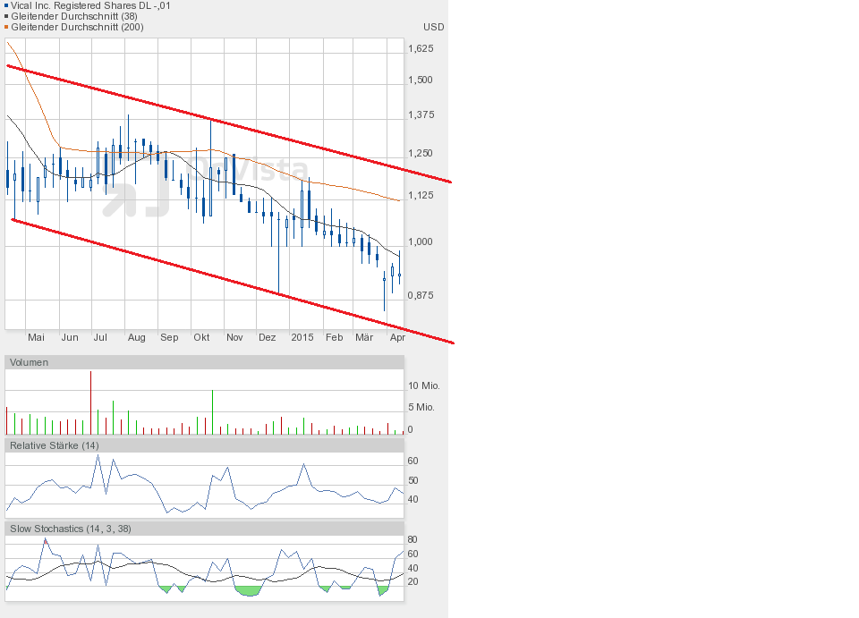 Gestern jedenfalls ging es weiter runter. Die Unterstützung bei 0,90$ ist gefallen. Schlusskurs 0,86$. Dem Chartbild entnehmend befindet sich die Aktie in dem grünen Abwärtstrendkanal. Besserung gibt es weiterhin erst oberhalb 0,95$.