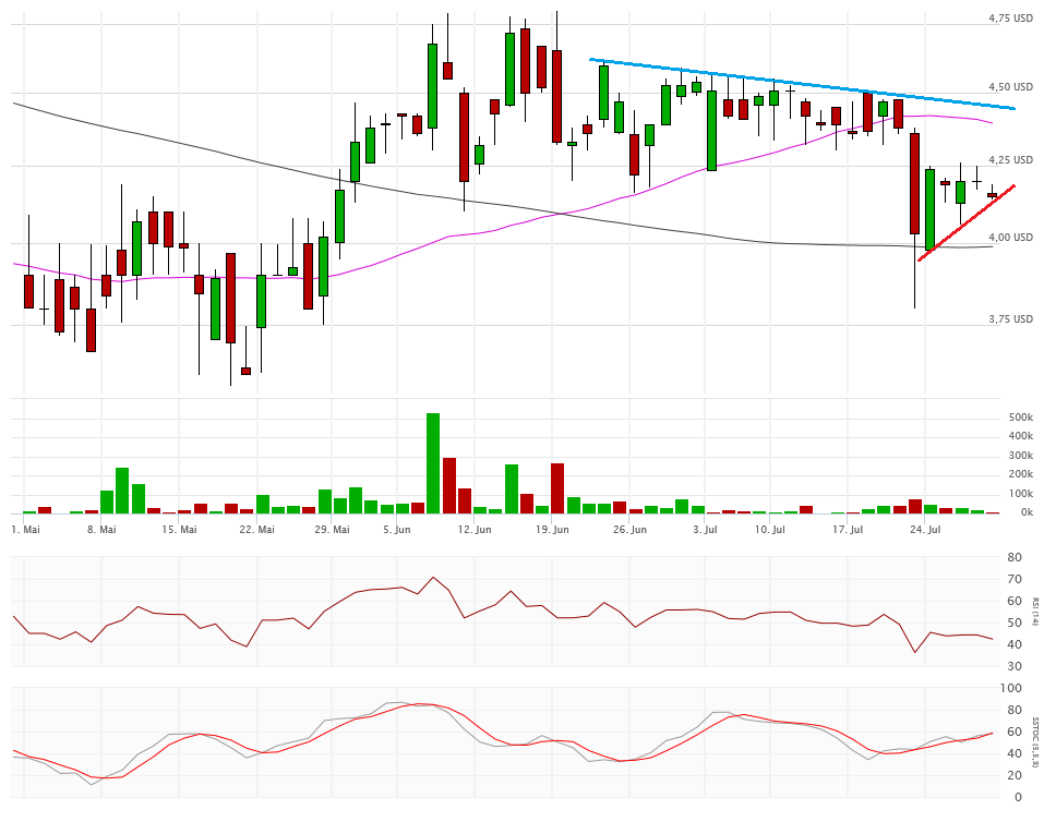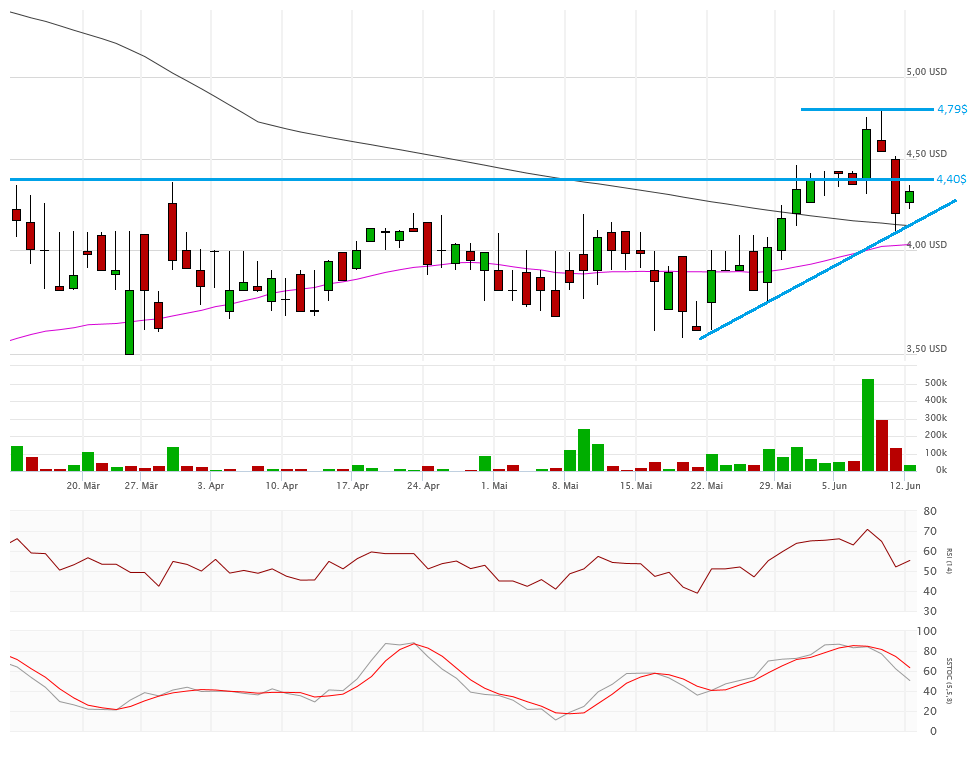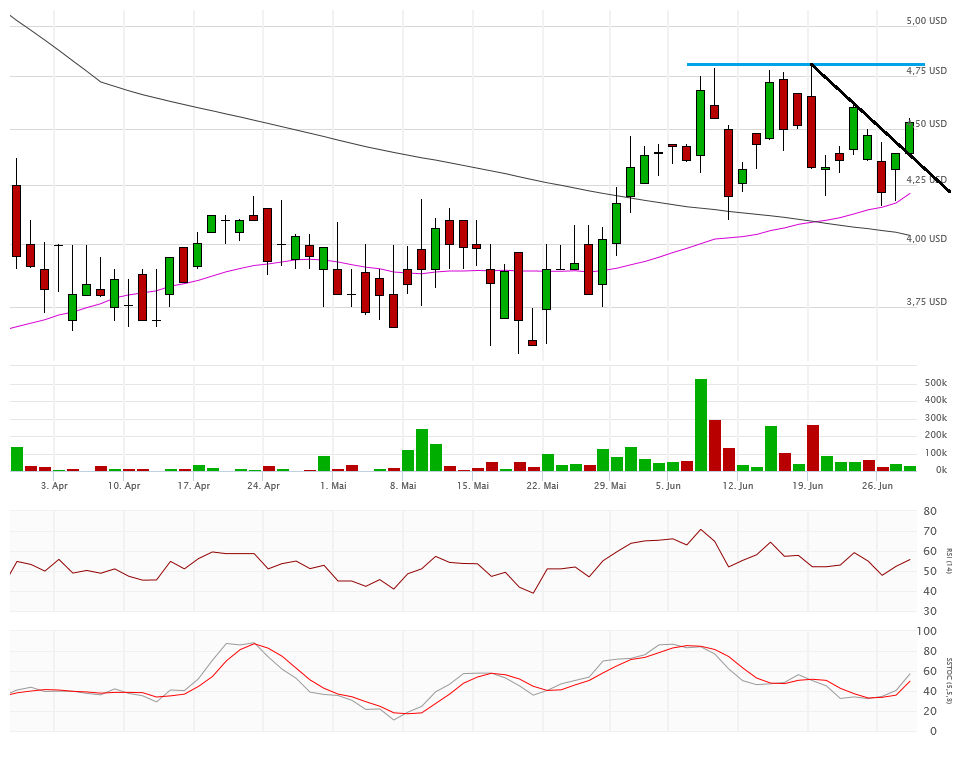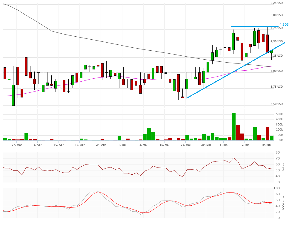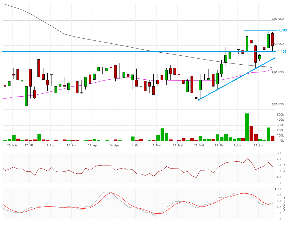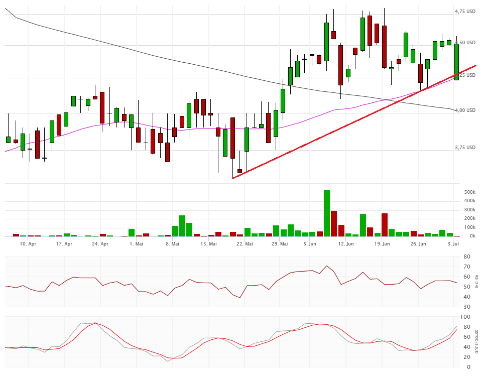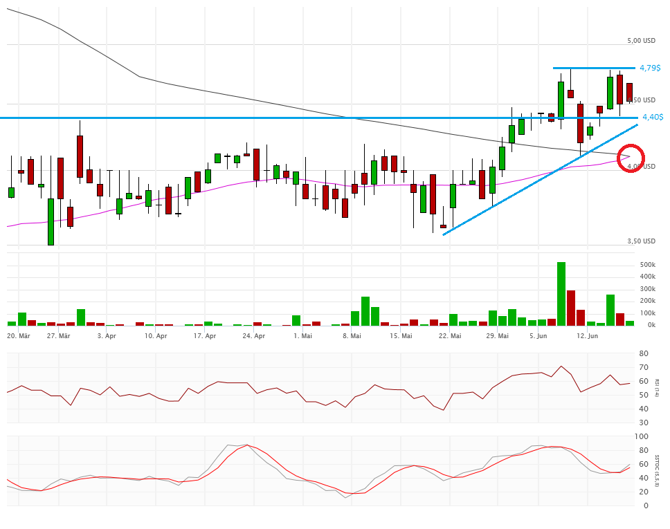 Die beiden Durchschnittslinien kreuzen bullisch, was eigentlich positiv sein sollte. Mit dem Schlusskurs auf Tagestief bei 4,33$ hängt die Aktie nun aber exakt auf der Aufwärtstrendlinie auf. Kann sich die Aktie hier wieder erholen, dann ist auch die 4,80$ wieder ein Thema, sonst droht ein Abrutschen in den Bereich 4,10$ und drunter. Das würde die bullische Kreuzung der Durchschnittslinien zu einem Fehlsignal mutieren lassen.
