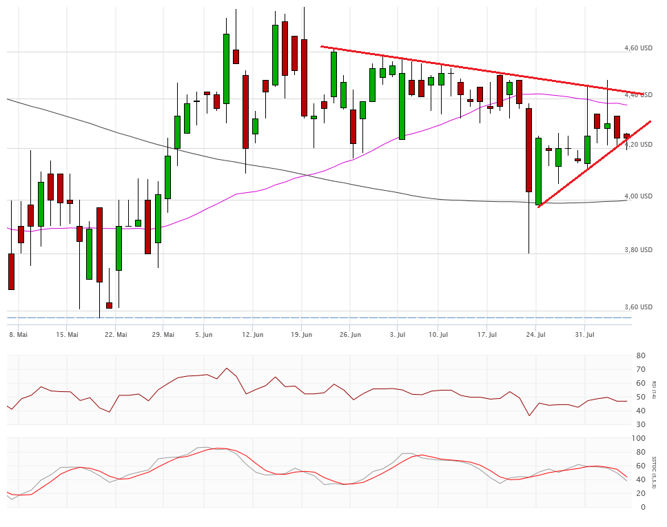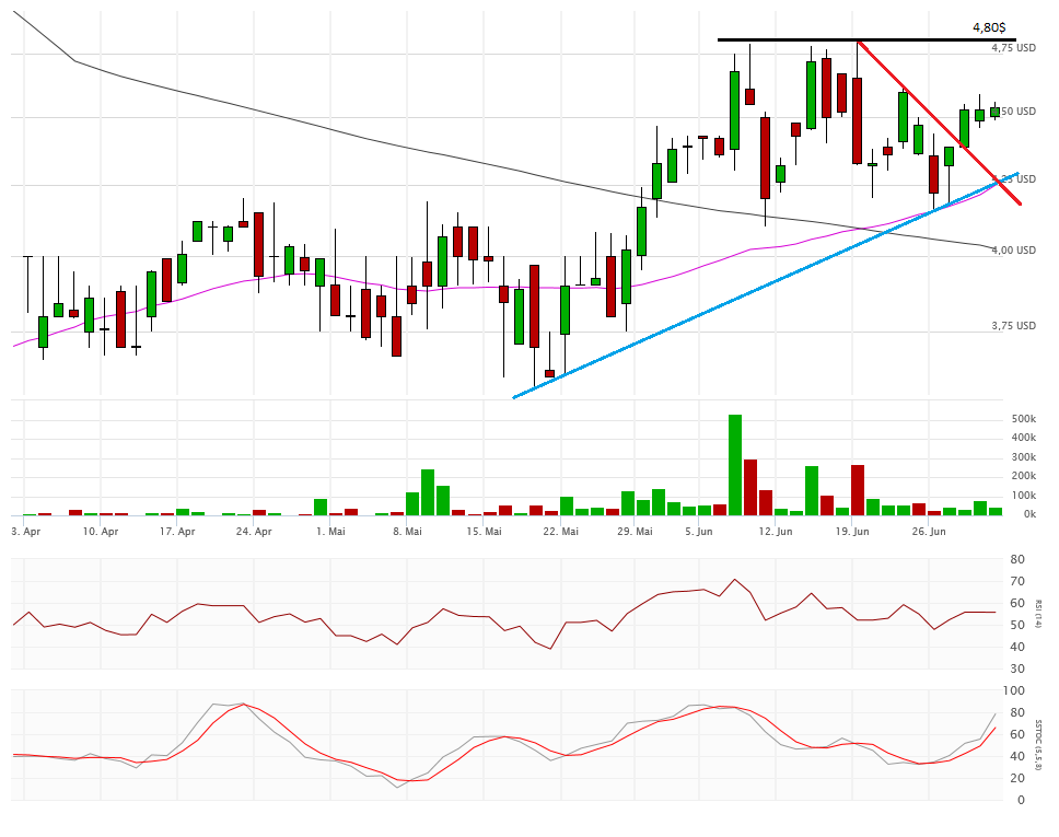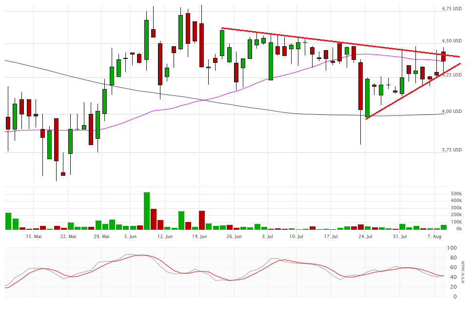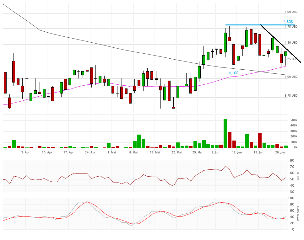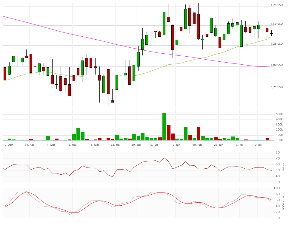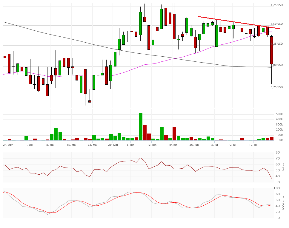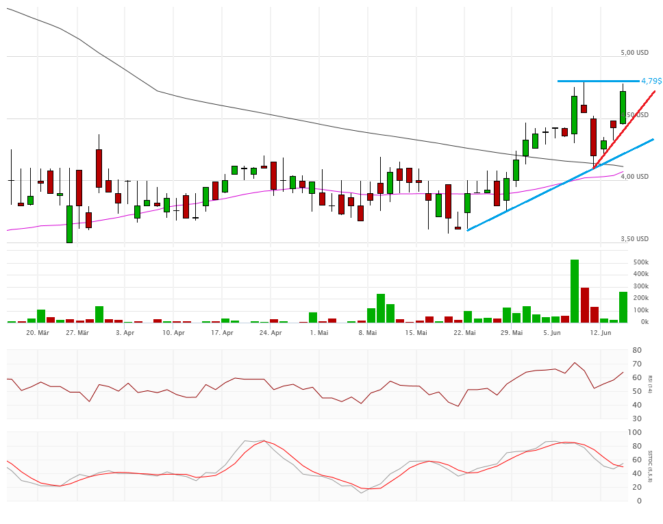 Die beiden Durchschnittslinien kreuzen bullisch, was eigentlich positiv sein sollte. Mit dem Schlusskurs auf Tagestief bei 4,33$ hängt die Aktie nun aber exakt auf der Aufwärtstrendlinie auf. Kann sich die Aktie hier wieder erholen, dann ist auch die 4,80$ wieder ein Thema, sonst droht ein Abrutschen in den Bereich 4,10$ und drunter. Das würde die bullische Kreuzung der Durchschnittslinien zu einem Fehlsignal mutieren lassen.