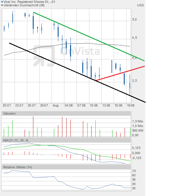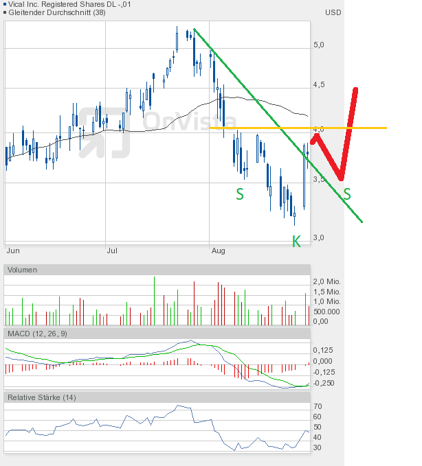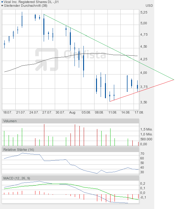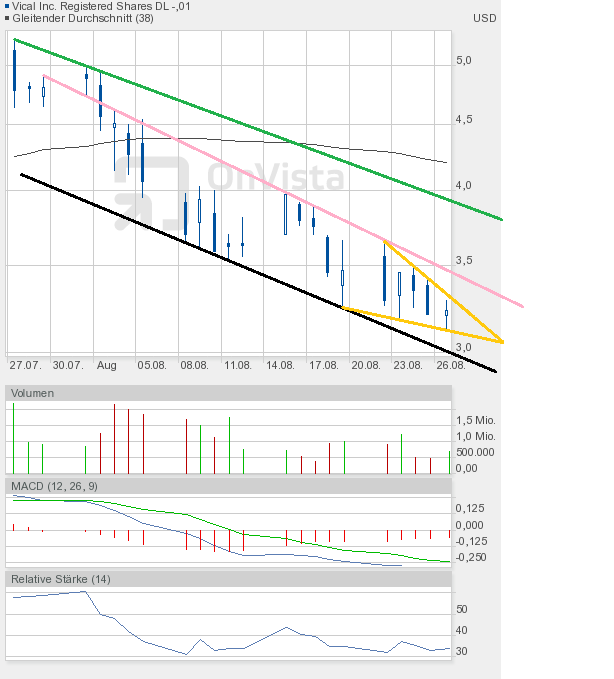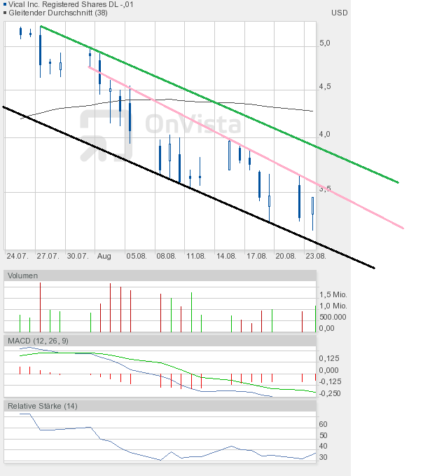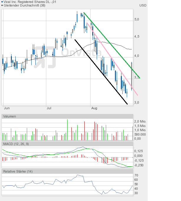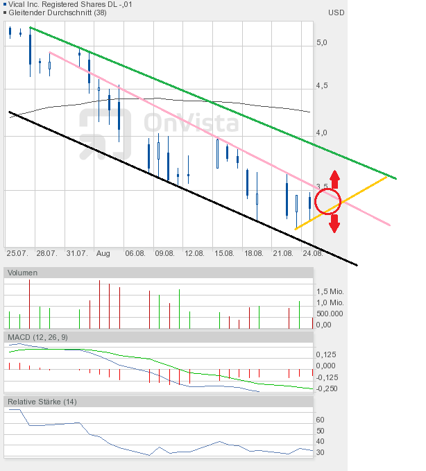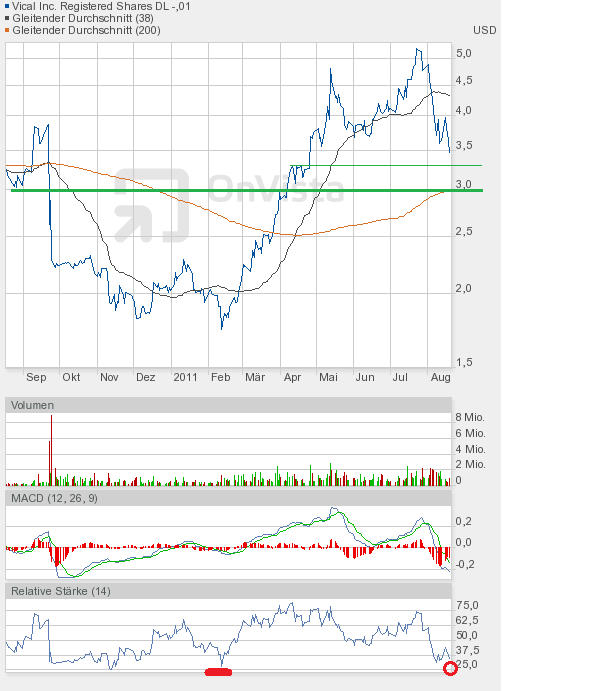 Das Chartbild ist nun etwas zerschossen. Eine kleine Unterstützung stellt die 3,36$ dar. Wenn man aber die Kursverluste an den Märkten und von Vical heute schon gesehen hat, dann scheint es nahezu logisch, dass diese Unterstützung nicht sehr lange von Dauer sein wird. Ich gehe davon aus, dass der Zug erst bei 3$ zum stehen kommt. Ich wiederhole mich, diese Zone werde ich zum Nachkaufen nutzen. Wie man dem RSI im Chart ganz unten entnehmen kann, hat er wieder Fahrt nach unten aufgenommen. Den Kursverlust von heute nahegelegt, dürfte die untere Extremzone, also der überverkaufte Bereich, bei einem Kurs von knapp über 3$ erreicht sein. Ab dann sollte man immer mit dem Beginn einer Rally rechnen. Als Ziel könnte ich mir dann vorerst die 3,60$ vorstellen. Hauptziel einer jeden Gegenbewegung muss es aber sein, die Abwärtstrendlinie (grüne Linie im Chartbild von gestern) zu durchstoßen. Aktuell verläuft sie um 4,20$. In 4 Wochen wird sie aber schon bei 3,20$ verlaufen. Es sollte also möglich sein, diese Linie im September zu überwinden. Das würde die charttechnische Situation aufhellen. Aber zunächst sind gute Nerven gefragt.