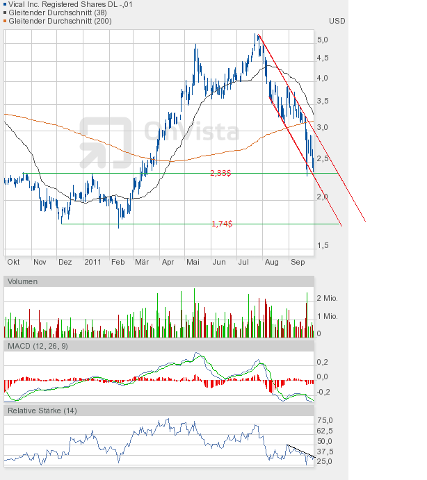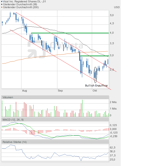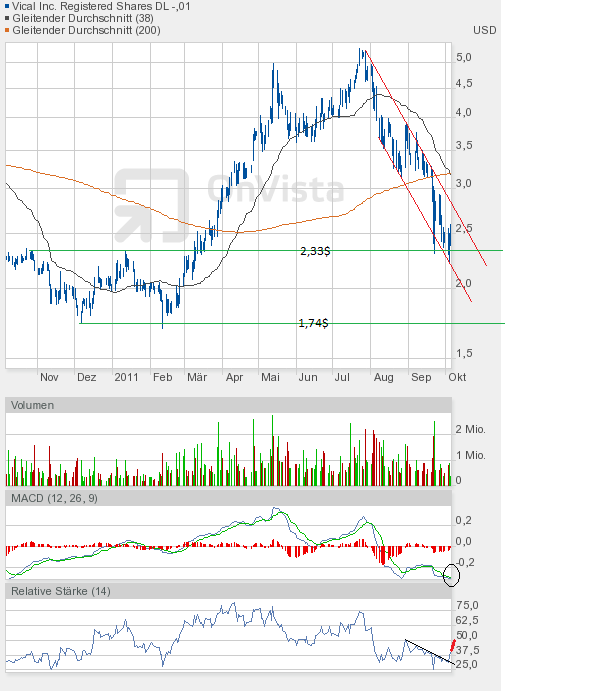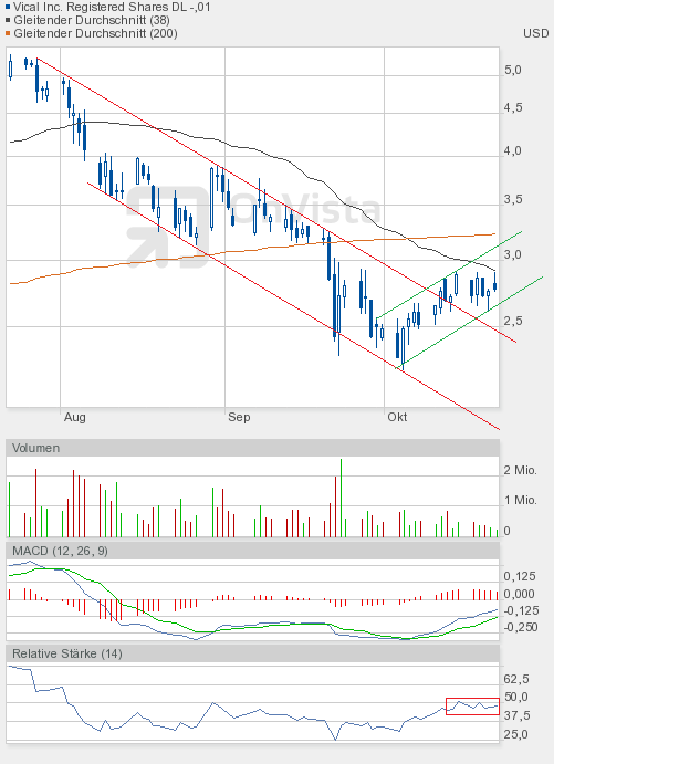 Schlusskurs 2,80$. Wenn auch gleich noch keine charttechnische Entscheidung gefallen ist. Ich vermute mal, dass der Oktober den Aktienkurs oberhalb des Abwärtstrendkanals wird etablieren können, solange im Vorfeld die Unterstützung um 2,33$ hält. Der RSI und MACD zeigen schließlich eine "ausgebombte" Vical-Aktie an.