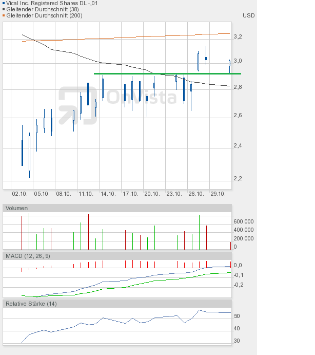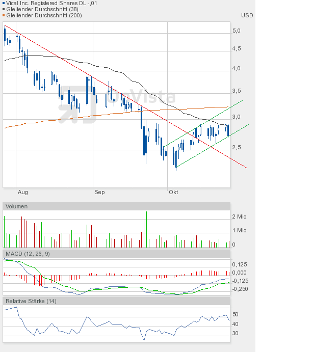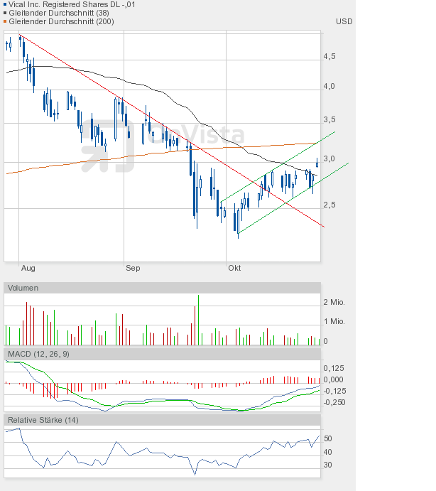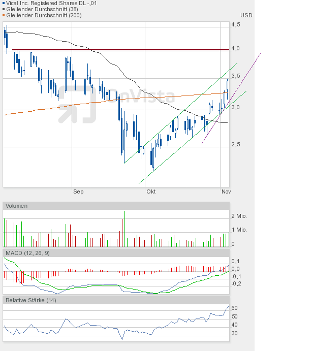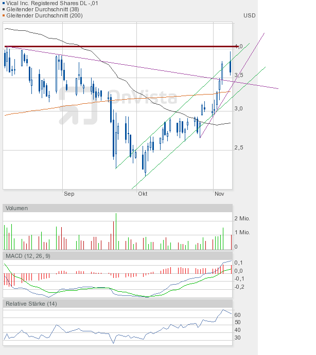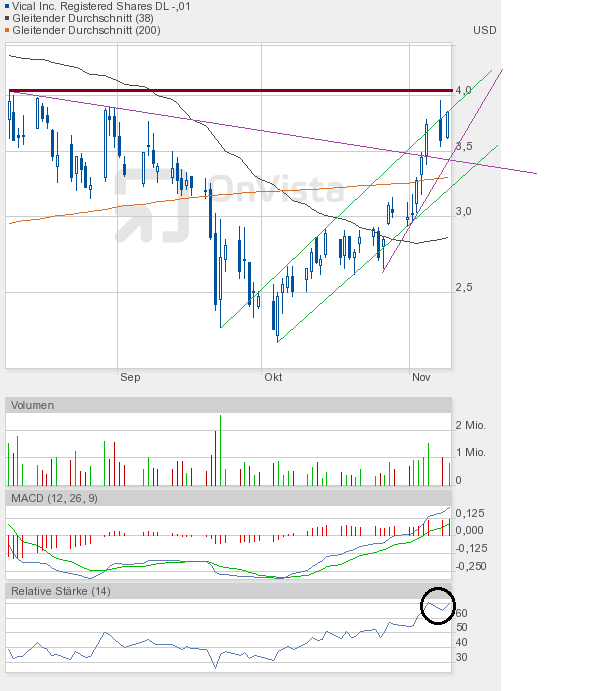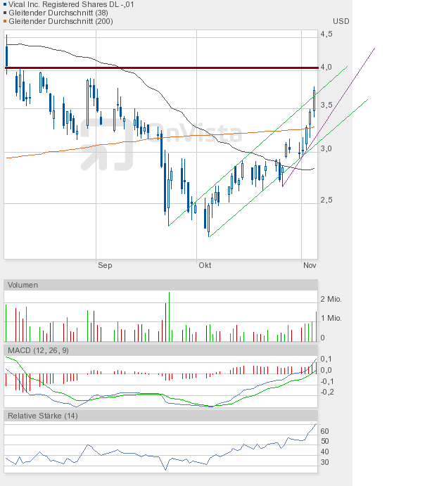 Vical hat es tatsächlich geschafft, aus dem Aufwärtstrend nach oben auszubrechen. Und nicht nur intraday, sondern auch auf Schlusskursbasis. Da muss man sich erst die Augen reiben, um sicher zu sein, dass man sich nicht verguckt hat. Wie ich schon erwähnte, sehe ich diesen Ausbruch als Übertreibung an und gehe ganz klar davon aus, dass wir uns ziemlich am Ende der Rally befinden. Das schließt aber nicht aus, dass wir noch die 4-Dollar-Marke erreichen können, zumal, wie gesagt, ein Schlusskurs oberhalb des Aufwärtstrendkanals vorliegt. Das schreit förmlich nach 4$.