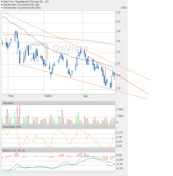 Oder kommt es endlich zum großen Ausbruch, also zur Auflösung des bullishen Keils? Es dürfte dann eine Rallye-Phase beginnen. Ein Indiz dafür könnte der Stochastic RSI liefern, der sich heute auf 0,25 halbierte, obwohl Vical nur 1 US-Cent nachgegeben hatte. Schlusskurs 3,00$. Also Augen auf beim Eierkauf.
