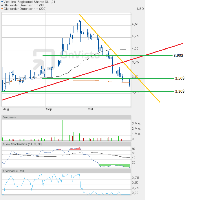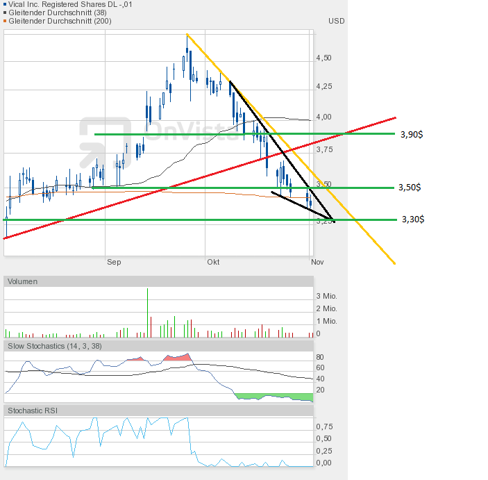 Nach Handelsbeginn und dem deutlichen Rutsch auf zunächst 3,10$ wurde dieser Trend von unten bei 3,25$ angelaufen, prallte dann aber ab.