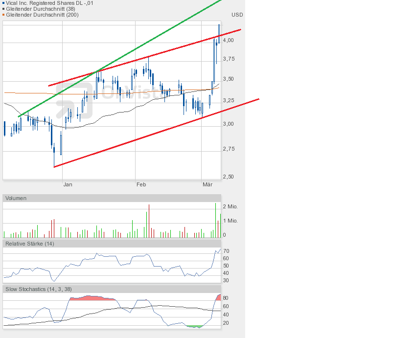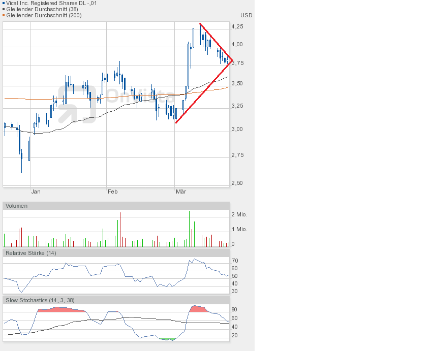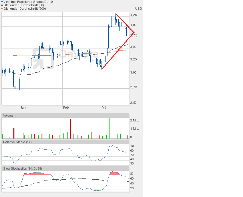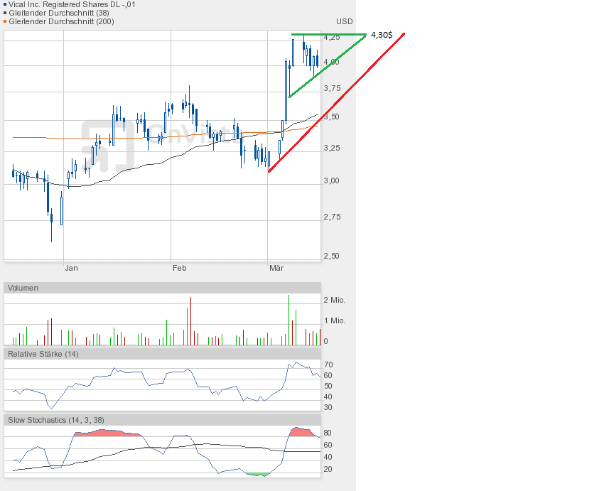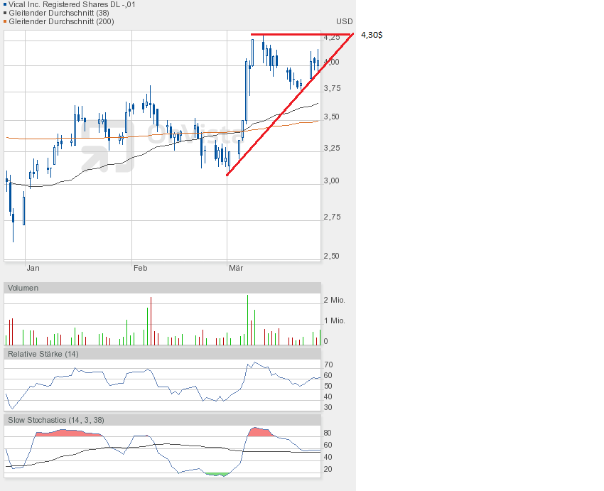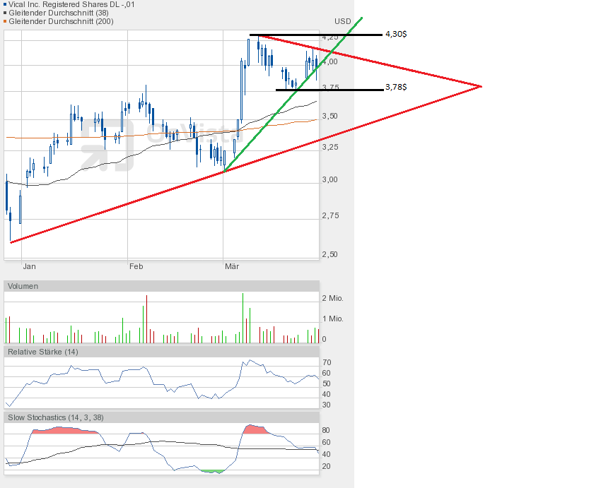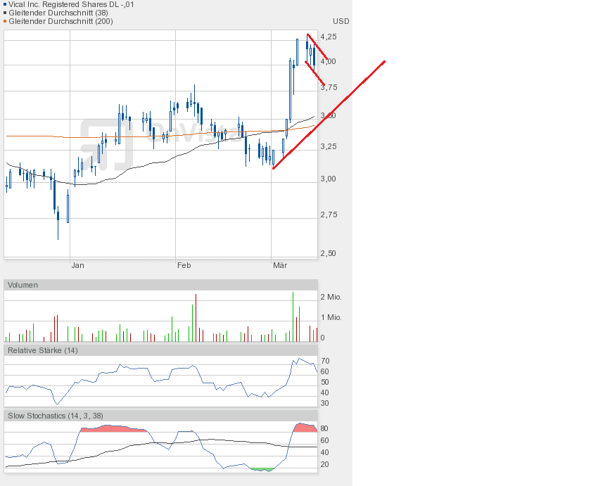 An den Börsen befürchtet man eine Korrektur, das würde auch Vical an Performance kosten. Deshalb habe ich nun einen neuen übergeordneten Keil gezeichnet, beginnend bei 2,61$, dem Jahrestief 2012. Und man sieht, nach unten wäre noch reichlich Platz.