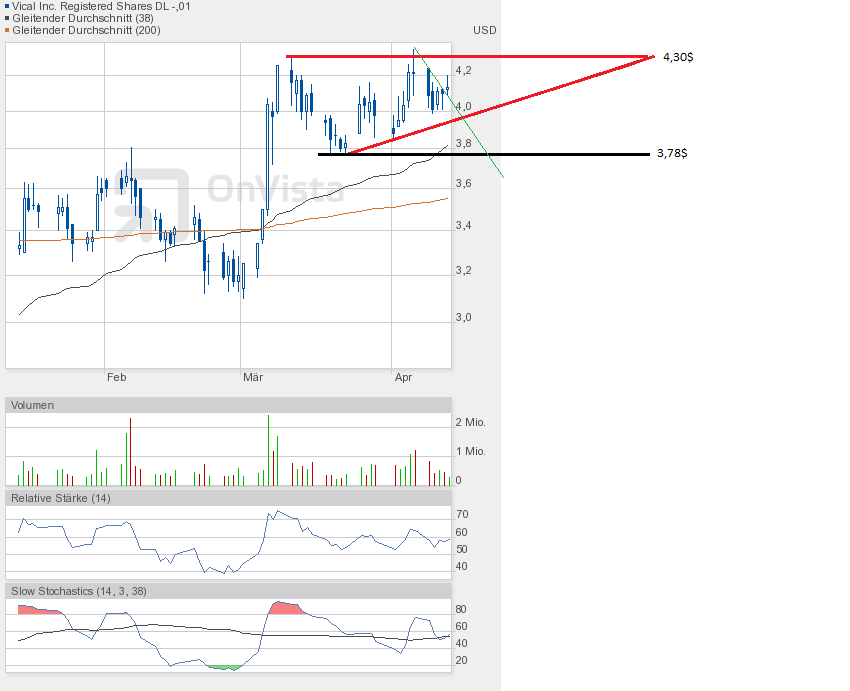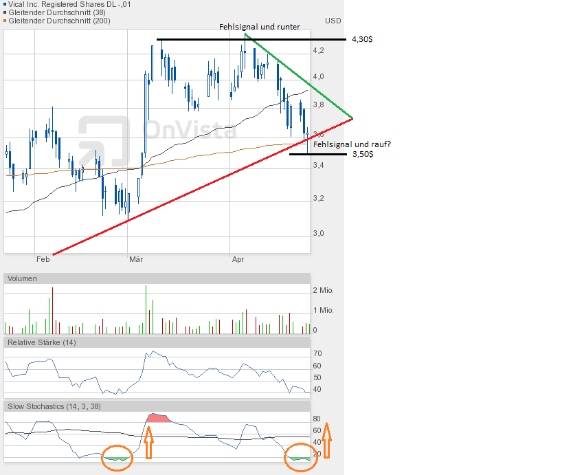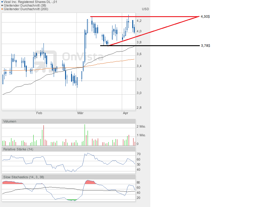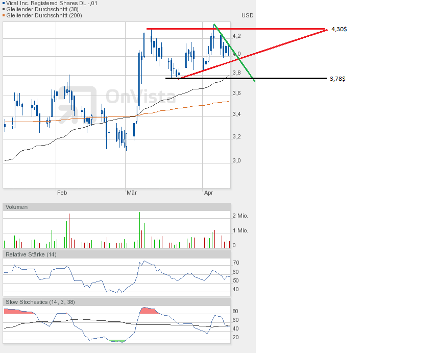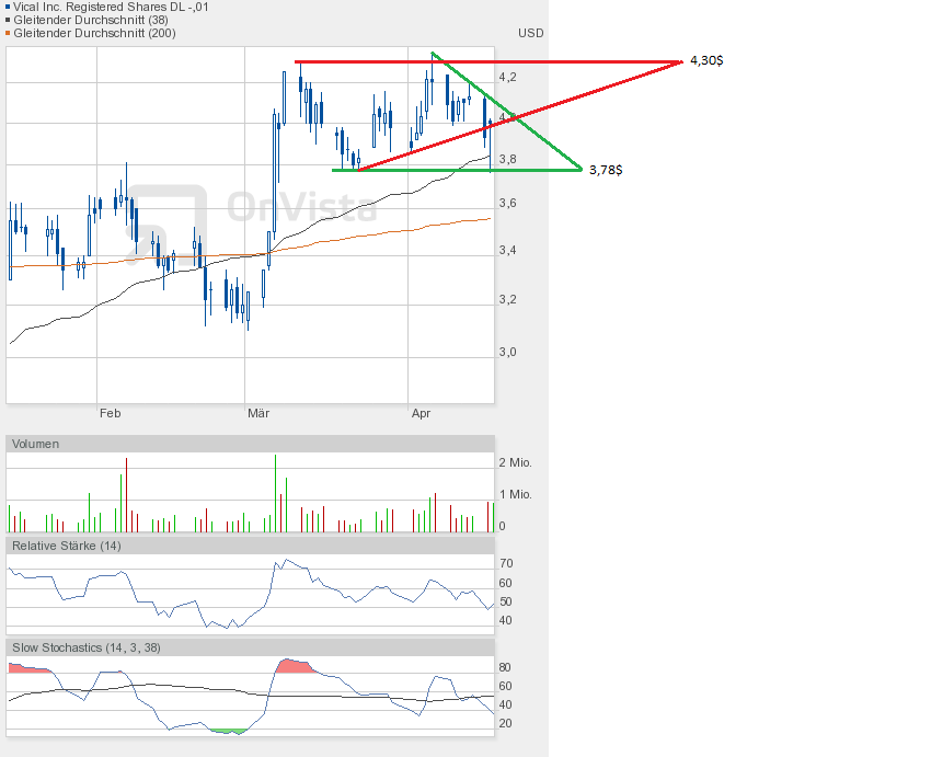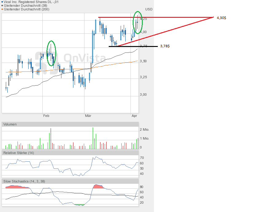 Kurz nach meinem letzten Beitrag fiel Vical wieder unter 4,30$ zurück. Es ging sogar bis auf Tagestief von 4,09$ nach unten. Am Ende sahen wir eine genauso schnelle Erholung. So schloss die Aktie nahezu unverändert bei 4,21$. Wie erwartet stieg das Volumen noch weiter an, 1,2Mio Aktien bei einer Handelsspanne von etwa 7%.