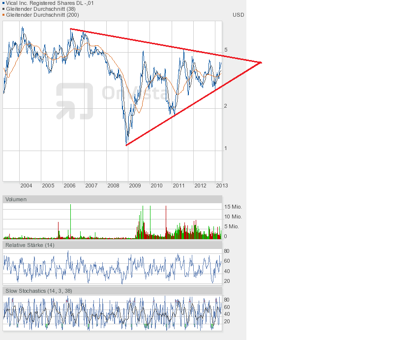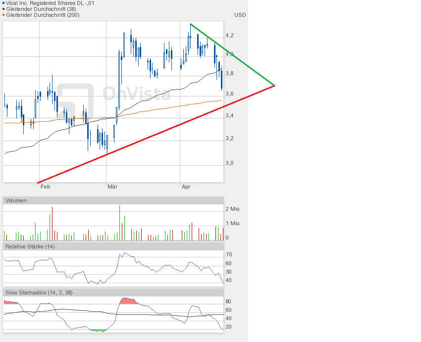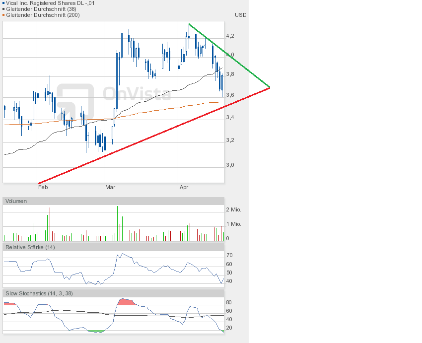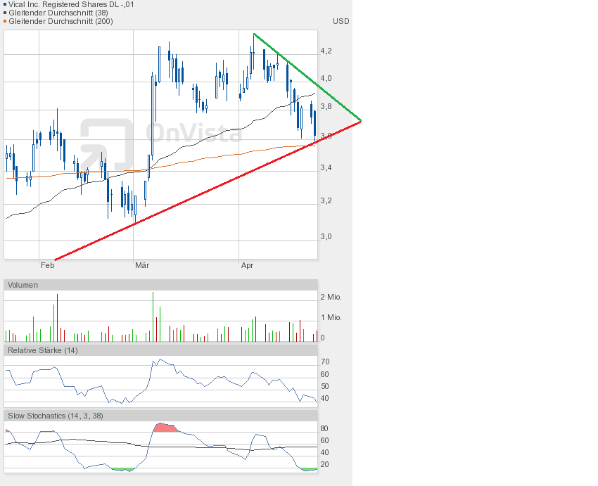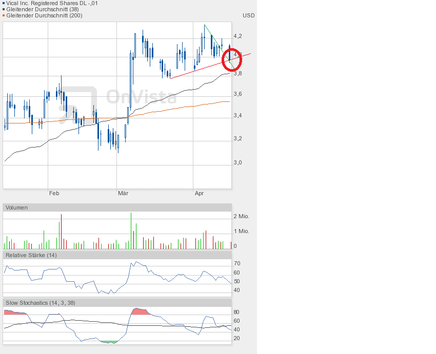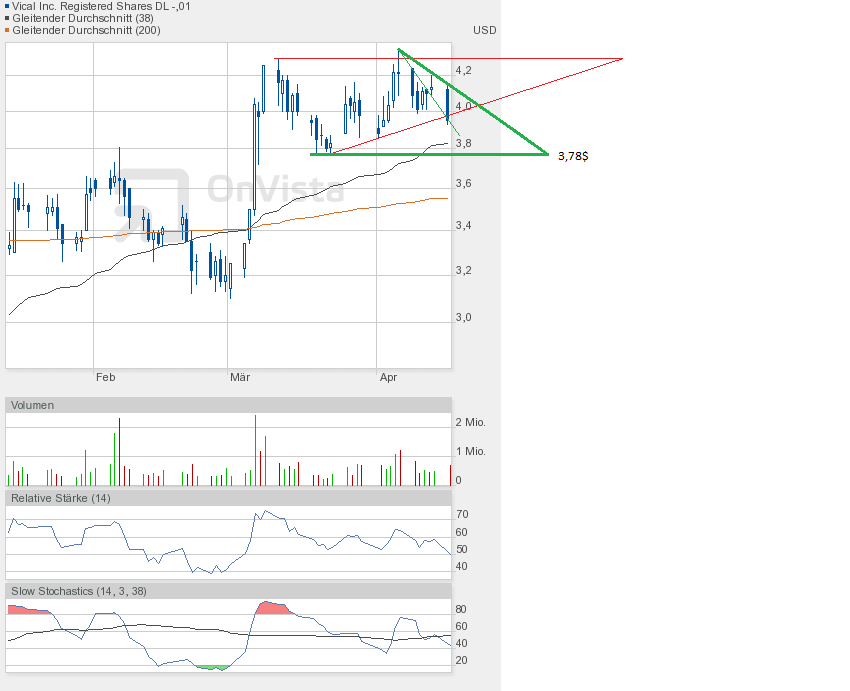 Kurz nach meinem letzten Beitrag fiel Vical wieder unter 4,30$ zurück. Es ging sogar bis auf Tagestief von 4,09$ nach unten. Am Ende sahen wir eine genauso schnelle Erholung. So schloss die Aktie nahezu unverändert bei 4,21$. Wie erwartet stieg das Volumen noch weiter an, 1,2Mio Aktien bei einer Handelsspanne von etwa 7%.