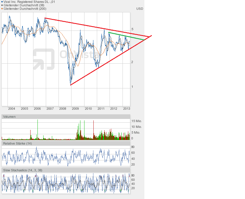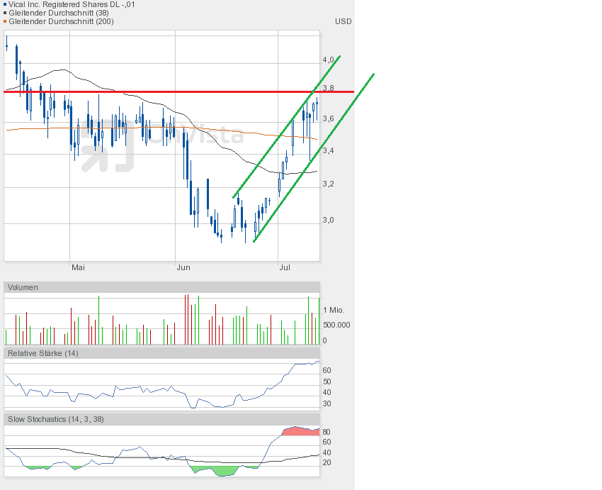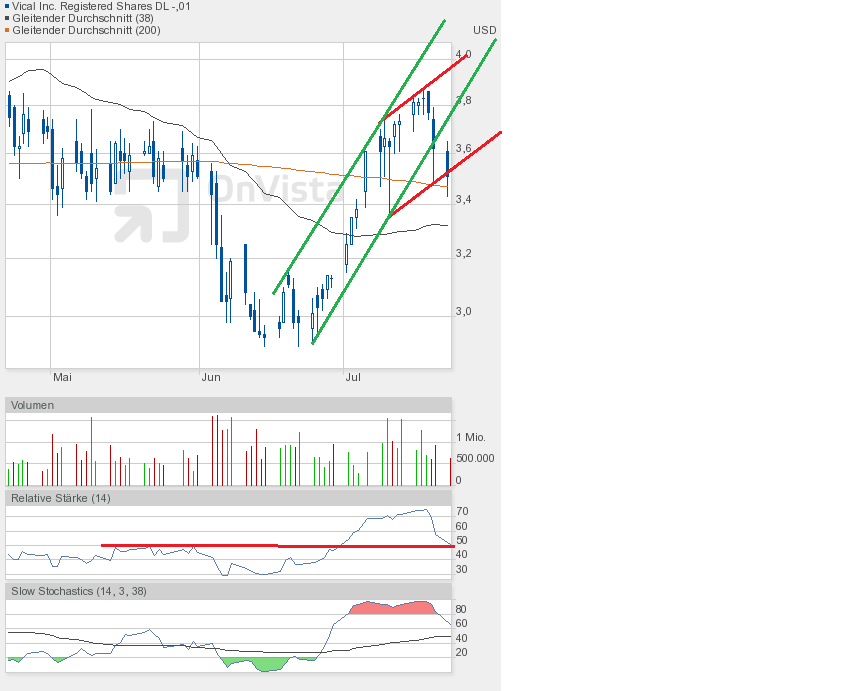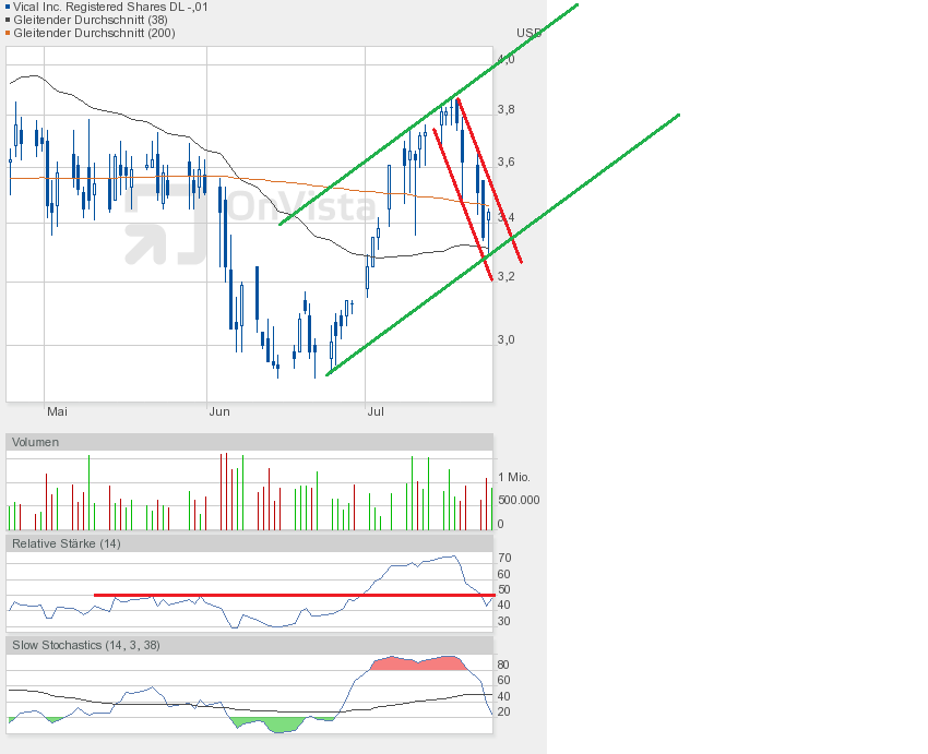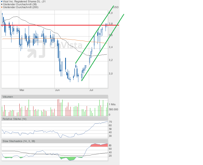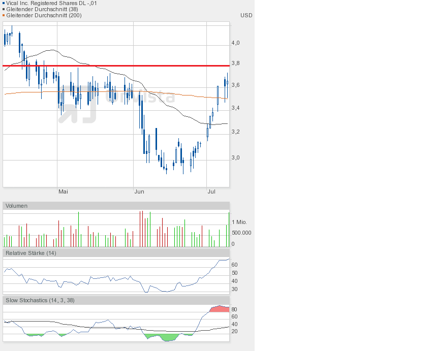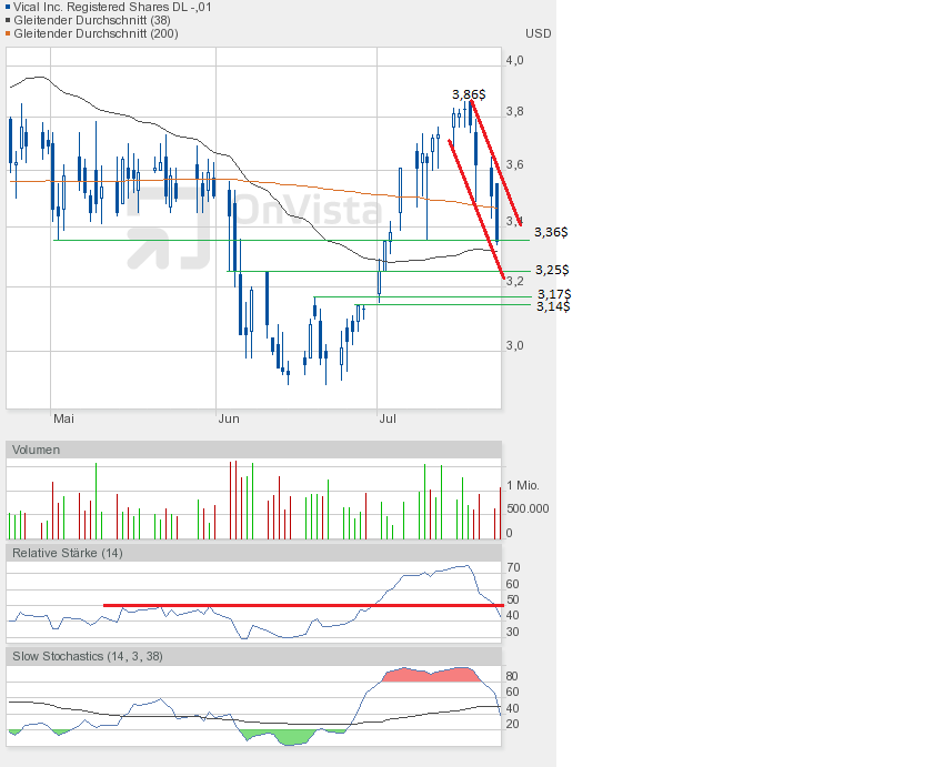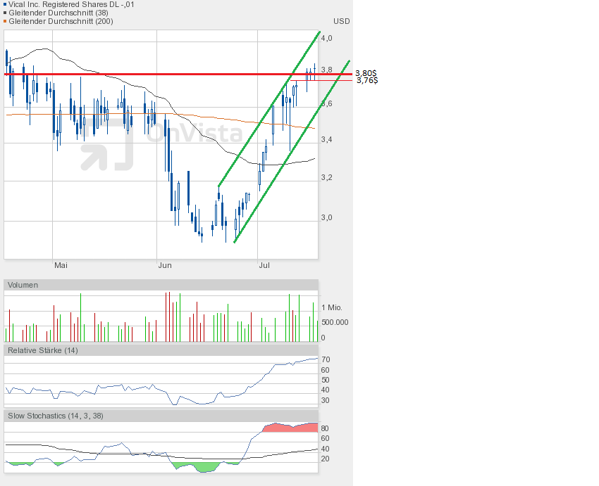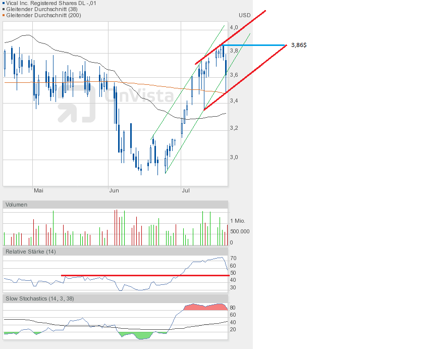 Diese Woche hielt ich 4$ für möglich, aber bei 3,86$ war schon Schluss. Die Aktie war seit Tagen extremst überkauft, sodass eine Abkühlung irgendwann auch mal sein muss. Am Mittwoch hatte ich schon darauf hingewiesen, dass unter 3,76$ eine kleine Verkaufswelle eintreten würde. Und die haben wir heute gesehen. Aber ich muss ganz klar sagen, dass ich damit nicht gerechnet habe. Wäre auch zu schön, wenn man immer richtig liegen würde. Aber die Indikatoren sind nun so weit abgekühlt, dass nun reichlich Potenzial nach oben gewährleistet ist. Vical braucht ein neues Hoch. Ein Kurs über 3,86$.