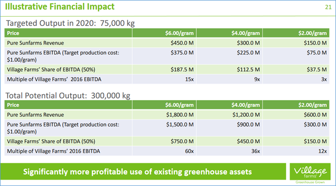 Kann das Village Farms die Erwartungen einhalten, dann käme dies einer Marktführerschaft gleich. Und das würde normalerweise einen Bewertungs-Aufschlag bedeuten – siehe Canopy oder Aurora.