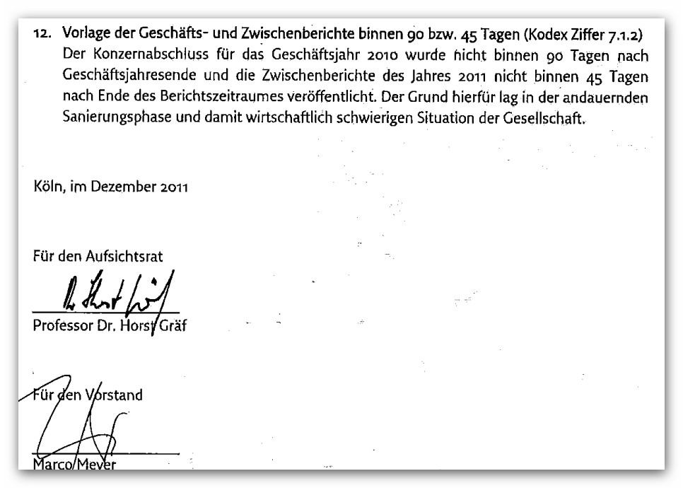 Zwar ist die Prüfung der Zahlen für das Geschäftsjahr 2010 bereits seit längerer Zeit abgeschlossen, aufgrund der nach wie vor bestehenden Unsicherheiten im Hinblick auf den erfolgreichen Abschluss der Sanierung konnten wir unsere Wirtschaftsprüfer von Ernst & Young gleichwohl noch nicht davon überzeugen, uns mit der Testierung der Jahresabschlüsse 2010 (Vivacon AG und Vivacon-Konzern) in die Lage zu versetzen, endlich unseren Pflichten gegenüber unseren Aktionären und dem Kapitalmarkt nachzukommen.