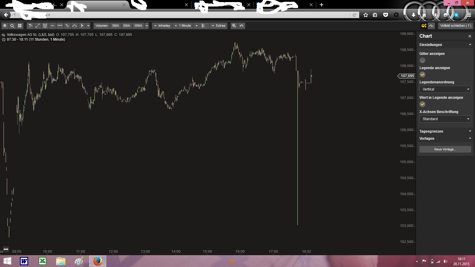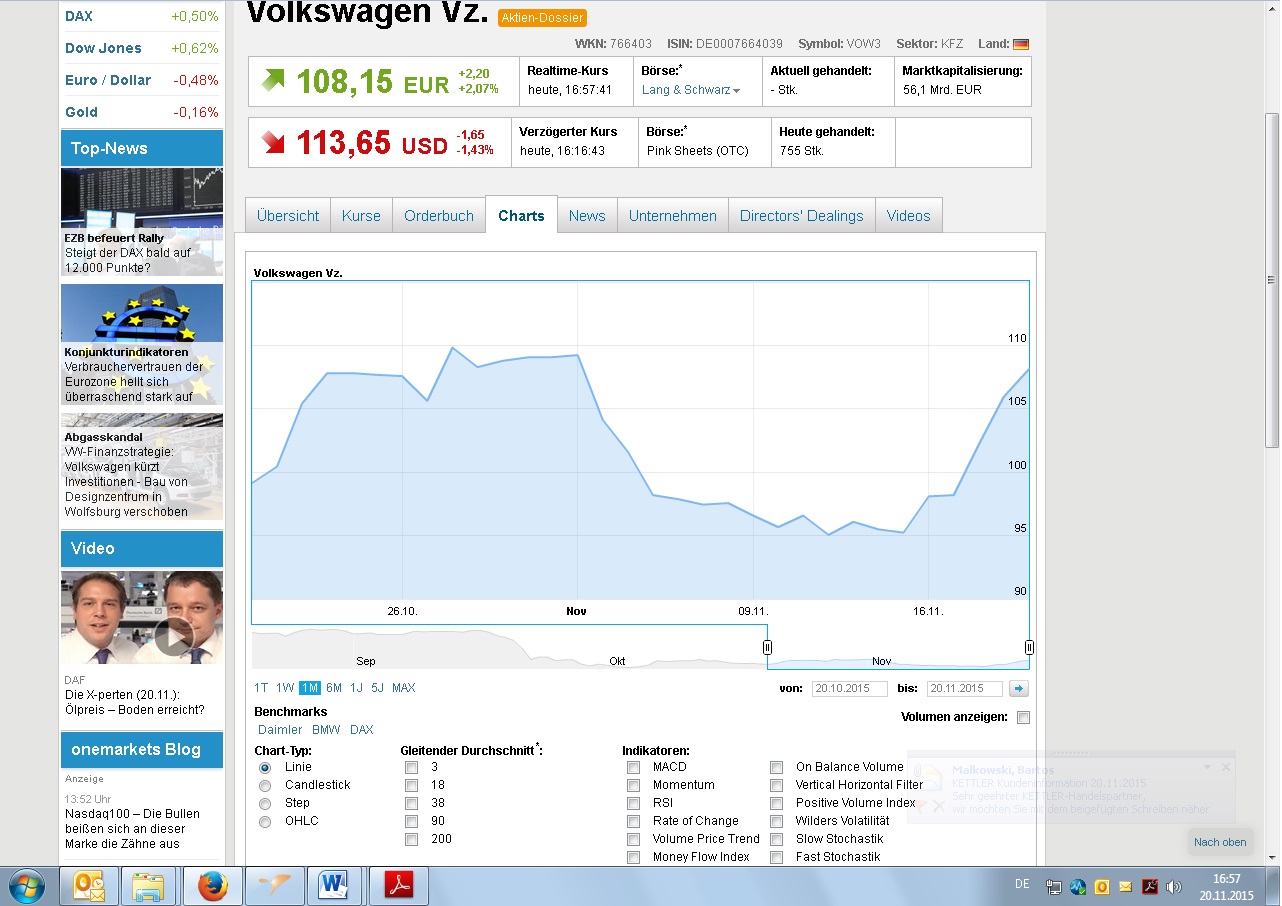 die grundregel unter 100,-- kaufen über 100,-- verkaufen kann man so mal stehen lassen. wird sich zeigen, wie es im bereich 109/110,-- weitergeht. irgendwie glaube ich nicht an einen glatten durchmarsch und wenn doch, mitzocken geht immer. eine längere seitwärtsbewegung so grob zw. 90,-- und 110,-- wäre fürs traden eigentlich ganz angenehm. ;-) bis auf weiteres würde ich der aktie allenfalls 125,-- geben, das ist die hälfte des jahreshöchststandes. aber wer kann es schon genau sagen, wenn allein die schätzungen zu dieselgate zw. 20 und 50 Mrd streuen ?
