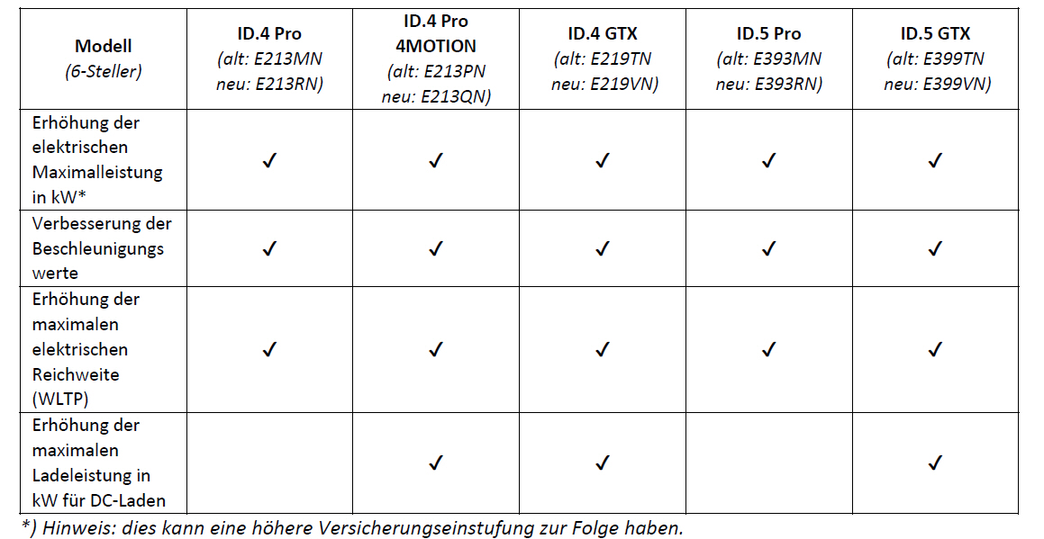 4MOTION / ID.4 GTX bzw. ID.5 Pro, ID.5 GTX die folgenden Änderungen ergeben: