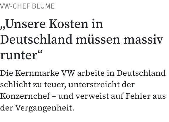 Stellantis geht's auch nicht gut, trotz Absturz stehen die aber im Vergleich noch gut da. Das große Problem sind die Werke in Italien die teils nur noch zu 10 Prozent ausgelastet sind. Ist also kein reines VW Problem, in Europa werden noch mehr Werke schließen müssen wenn man nicht auf Halde produzieren will. Gleichzeitig expandieren die Chinesen immer weiter, durch den Wegfall des Verbrenners ist die Einstiegshürde sehr gering. Gibt in China mittlerweile über 100 E-Autos Buden, die zudem alle auch staatlich gefördert werden. Was mir nicht gefällt, dass man immer mehr aus China übernimmt, die Bildschirme werden immer größer, eben Smartphones auf Räder. Finden die Chinesen wohl hipp, mich nervt das und vor allem das unsägliche Touch Zeugs. Die Autobranche wird aber als nächstes platt gemacht. Lediglich Toyota war so schlau den E Hype nicht mitgemacht zu haben, die verkaufen weiterhin zu 99 Prozent Verbrenner und Hybride und forschen zudem an der Brennstoffzelle und entwickeln neue Verbrenner Motoren die in Afrika und Südamerika noch die nächsten Jahrzehnte benötigt werden. Währendessen haben die Deutschen die Motorenentwicklung eingestellt und alles nach China verkauft