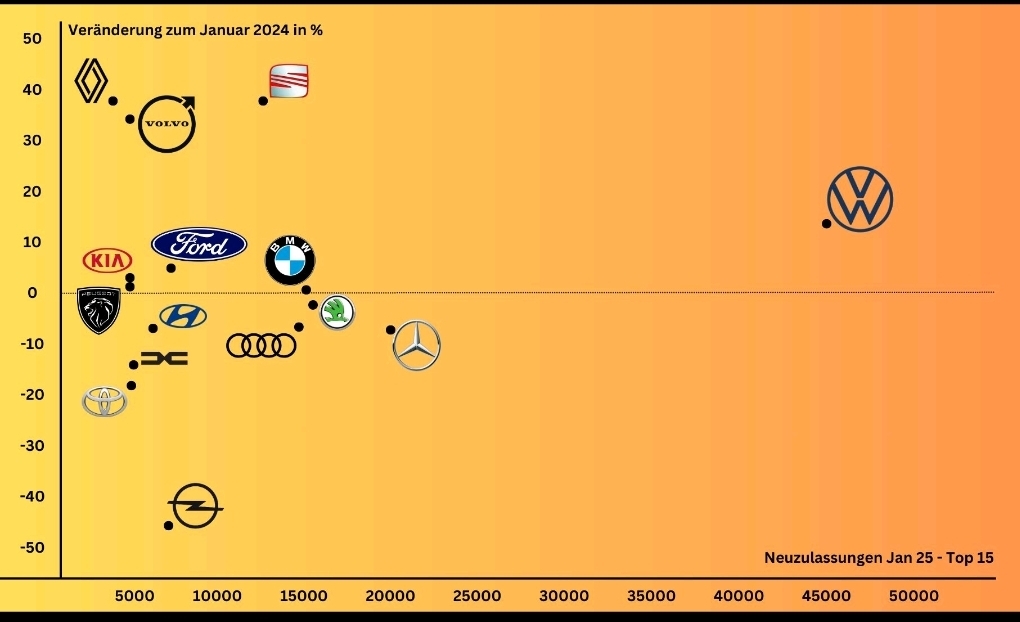 Nach Marken aufgeschlüsselt, verkaufte die Marke Volkswagen im Januar 77.030 Fahrzeuge, während Audi und JETTA einen Absatz von 54.270 bzw. 9.100 Fahrzeugen verzeichneten.