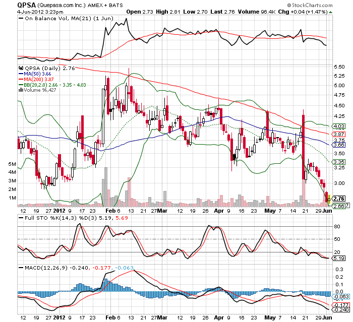 Vom Facebook-Wahn profitieren kann man mit der Quepasa-Aktie, dem größten Social Network-Anbieter in Lateinamerika. Quepasa ist an der Amex-Börse in den USA gelistet und ist neben Facebook zweiter Marktführer in Südamerika. Im Vorfeld und während des historischen Börsenganges von Facebook dürfte auch Quepasa ordentlich zulegen. Bis Freitag zum Börsengang von Facebook sollte es keine Stücke mehr unter 5 USD geben. Dürfte sogar heute gegen US-Handelsende weiter deutlich anziehen.