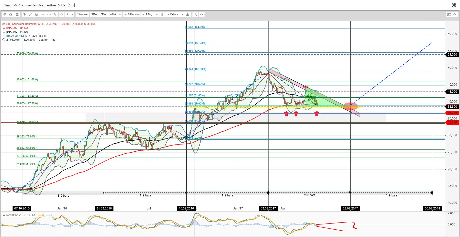 - Seit Anfang April ist der Kurs 3-mal bei um 38,60EUR im Daily nach oben abgeprallt, (heute mitgezählt) so dass sich diese Marke, sofern sie auch nächste Woche noch Bestand hat, als Unterstützungsmarke gewertet werden kann. (Abwärts-Dips im Tageshandel unter diese Unterstützungszone, wie am 03.05.2017 geschehen, möchte ich dabei nicht überbewerten. Charttechnik ist in einem marktengen Wert wie dem von SNP sowieso mit Vorsicht zu genießen, schadet aber m.E. als zusätzlicher Indikator zur Fundamentalanalyse und Investitionsentscheidung nicht, sondern kann diese im Optimalfall sogar bestätigen/unterstützen.) Sofern die 38,00EUR Marke per Tagesschlusskurs nach unten gebrochen wird, und da gebe ich mora77 Recht, könnte ein Kursrücklauf bis 37,00/36,00EUR erfolgen und die Bodenbildungstheorie ist hinfällig! Weiter darunter wäre der Weg m.E. im Niemandsland frei bis 34,00EUR.