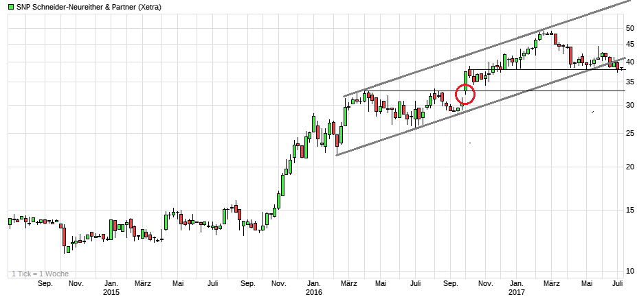 - Auffällig sind ebenfalls die relativ chronologisch verlaufenden Wellenbewegungen von Kursanstiegen und der Konsolidierung im Chartbild seit 10.2015, die zwar keine Gewähr für einen weiteren ähnlichen Kursverlauf geben, aber wir müssen mit den Informationen arbeiten die wir haben. Führt man die Wellenbewegungen in die Zukunft weiter, wobei Anstiegs- und Konsolidierungsphase/n bisher jeweils ca. 119 Handelstage ausmachten, dann erreicht SNP Anfang 2018 einen Kurs von 54,00EUR +/- X. Ich vermag nicht zu beurteilen, ob das KGV zu diesem Zeitpunkt in dieser Region gerechtfertigt ist. Zunächst sollte SNP die Neuerwerbungen der jüngeren Vergangenheit homogen ins Unternehmensgefüge integrieren, dann werden wir anhand des Unternehmensnewsflow hoffentlich informiert wohin die Reise geht. Hzenger hat dazu ja bereits dankenswerterweise einige interessante Prognosen dargelegt.
