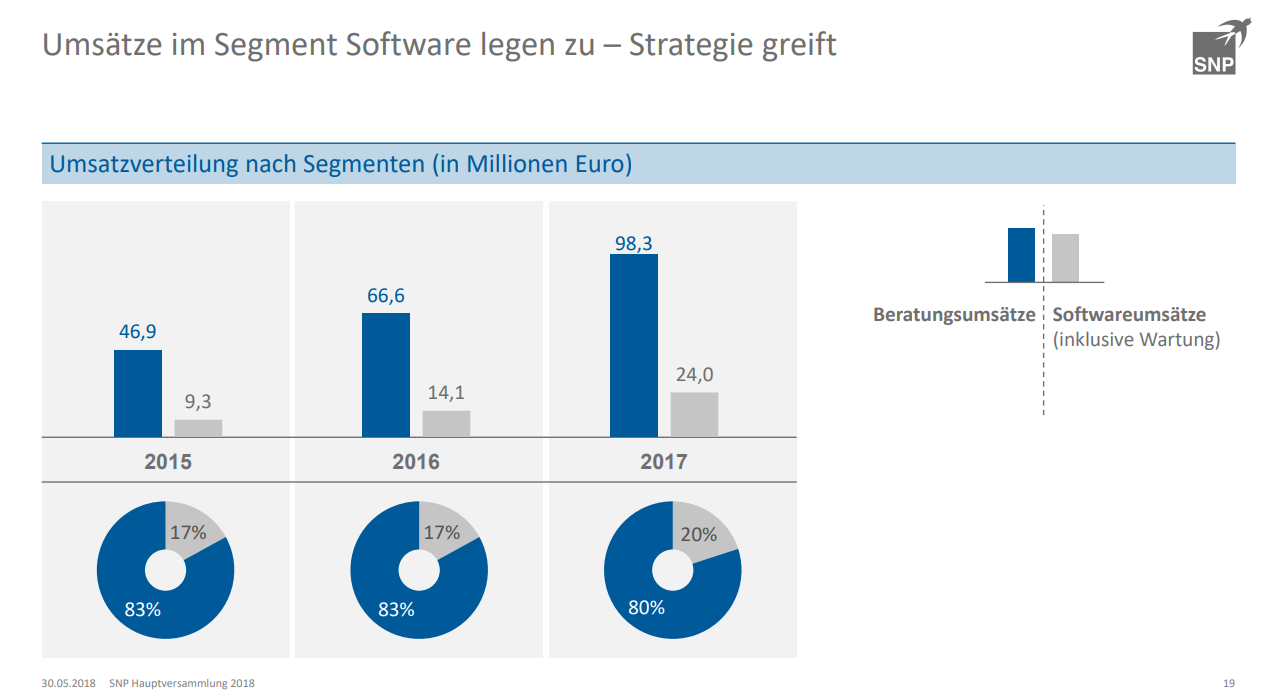 Neuer Vertriebsansatz, weg vom Verkauf von Manntagen, hin zum Verkauf über Mehrwert. Klar, bei Tagessätzen, sieht die Konkurrenz, durch MA in LowcostLändern, günstig aus, tatsächlich ist SNP durch die Technisch automatisierte Lösung, unterm Strich günstiger und schneller.