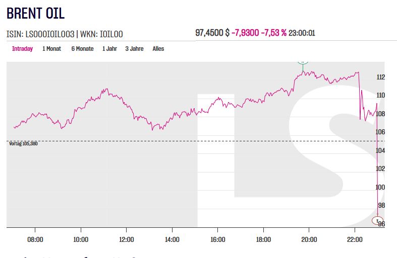Um 22:59 Uhr lief die Meldung über die Ticker, wonach Trump erwäge, die Angriffe auf den Iran zurückzufahren, da die USA unmittelbar davor stünden, die eigenen Ziele zu erreichen. Also ne knappe Minute vor Handelsschluss.