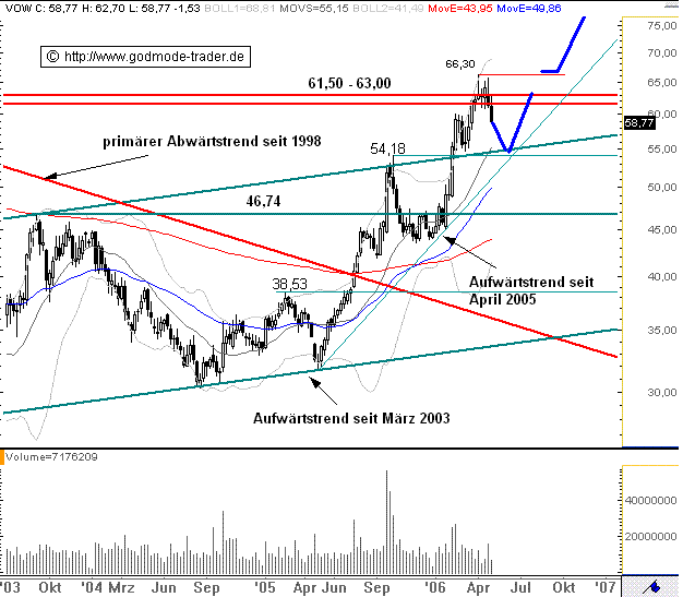 Charttechnischer Ausblick: Die VOLKSWAGEN Aktie sollte kurzfristig noch in den Bereich um 54,18 Euro abfallen. Dort besteht dann eine sehr gute Chancen auf einen erneuten Angriff auf die dicke Widerstandszone 61,50-63,00 Euro. Gelingt dann ein signifikanter Ausbruch, ist weiteres Potenzial bis zumindest ca. 80,00 Euro evtl. auch ca. 88,00 Euro vorhanden Ein Wochenschlusskurs unter 54,18 Euro wäre aber klar negativ zu werten und eine deutlichere Korrekturbewegung nach sich ziehen.