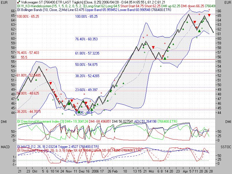 Rückblick: Die VOLKSWAGEN Aktie befindet sich in einer langfristigen Aufwärtsbewegung. In den letzten Woche kämpfte die Aktie gegen die Widerstandszone 61,50-63,00 Euro an. Sie notierte mehrmals darüber und bildete dabei ein Hoch bei 66,30 Euro. Einmal beendete sich auch eine Woche über der Zone. Dennoch fällt die Aktie nun wieder deutlich unter diese Widerstandszone zurück. Unterstützung findet die Aktie vor allem im Bereich um 54,18 Euro. Dieser Bereich ist für die mittelfristige Entwicklung der Aktie von entscheidender Bedeutung.