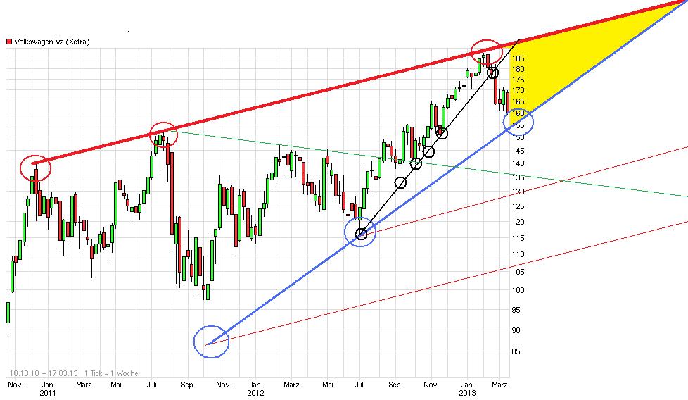 Ich bin auch der Auffassung, dass VW zu stark abgestraft wurde und Kurse von 158 € wir so schnell nicht mehr wieder sehen werden. Ich erkläre mir den letzten Kursverfall mit der riesigen Platzierung vergangene Woche. Ich erwarte einen sanften Anstieg auf 168 diese Woche bzw. Anfang nächster Woche. Vor den Zahlen glaube ich an einen Anstieg auf ca 175 €. Ich rate allen diese Chance wahrzunehmen, vorallem weil bei ca. 155 eine Unterstützung verläuft und somit die Verlustgrenze begrenzt ist insofern SL eingehalten werden!