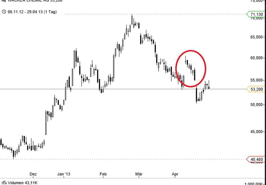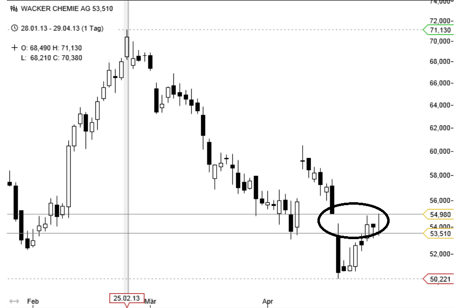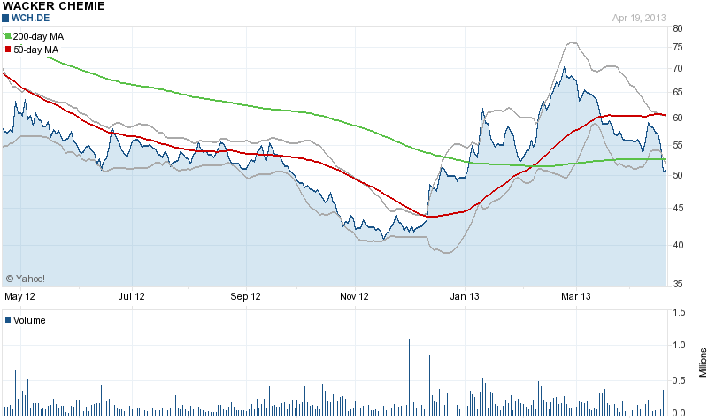 ABB übernimmt Power-One in den USA und mit dieser Meldung wird heute die Erholungsbewegung bei den Solarwerten fortgesetzt, die am Freitag bereits an der Nasdaq begonnen hatte. SMA Solar, ein direkter Mitbewerber von Power-One stiegen bereits knapp 10%. Auch bei Wacker hellt sich das Xetra-Orderbuch merklich auf und ich gehe davon aus, dass heute die 52 Euro getestet werden. Im Bereich um die 51 Euro hatte der Kurs von Wacker in 2012 eine deutliche und immer wieder erfolgreich getestete Unterstützung, die in ihrer Deutlichkeit auch heute noch Gültigkeit besitzt: