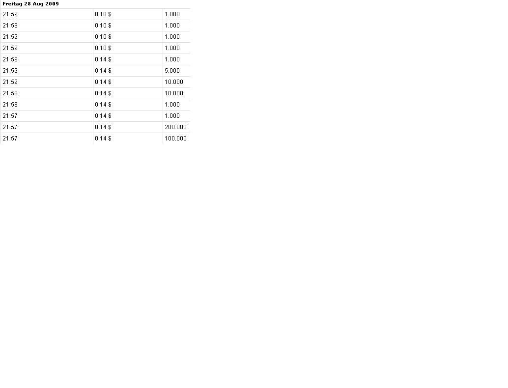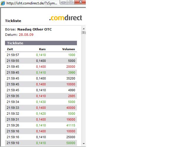 The first few minutes of trading on Monday should be very interesting and I feel will immediately show us the mood and direction we can expect heading into Labor Day weekend. If we see another high volume day, we may crack the 2 resistance levels mentioned by another poster. If this immediately drops to .12 or so, we will probably see another boring lackluster trading week! Ende des Zitats.