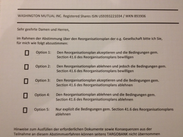 Das Broker Anschreiben solltet Ihr zuerst fertig machen. Also eine Email an alle Broker/Banken, wo Ihr WaMu Aktien haltet.