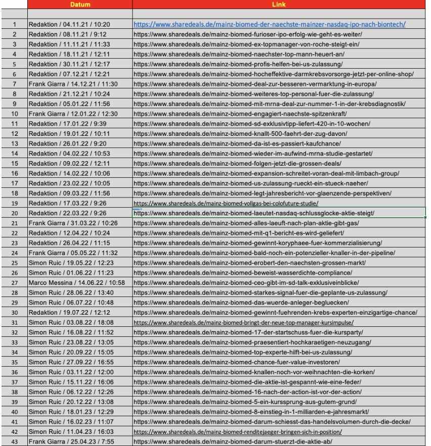 „Wir arbeiten engagiert daran unseren Business Plan voranzutreiben und einen Mehrwert für unsere Aktionäre zu generieren. Daher freue ich mich darauf, in New York mit unseren bestehenden sowie mit potenziellen neuen Investoren ins Gespräch zu kommen. “, sagte Guido Baechler, Chief Executive Officer von Mainz Biomed. „Wir blicken gespannt auf die verbleibenden Monate des Jahres 2023, da wir im September und im vierten Quartal klinische Daten aus unseren Machbarkeitsstudien in Europa und den USA erwarten. Diese Studien untersuchen unser Portfolio neuartiger mRNA-Biomarker, die gezeigt haben, dass sie nicht nur Darmkrebs identifizieren können, sondern auch fortgeschrittene Adenome, eine Art präkanzeröser Polypen. Fortgeschrittene Adenome sind gut behandelbar, wenn sie frühzeitig entdeckt werden. Eine gut funktionierende mRNA-basierte Screening-Methode hätte das Potenzial, die Diagnostik von Darmkrebs grundlegend zu verändern Ein solcher Ansatz wäre präventiv, da man die Vorstufe von Darmkrebs erkennen könnte, bevor daraus ein ernsthafteres Problem entsteht.“