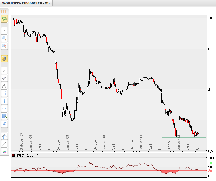 - zu Warimpex selbst: das Management selbst hat sich sicher nicht mit Ruhm bekleckert. Der IPO-Preis Anfang 2007 betrug 11 Euro, seitdem hat der Kurs 93 % nachgegeben. Investoren der ersten Stunde haben somit fast alles verloren. Offensichtlich waren die Erwartungen bzw. die Bewertungen des osteuropäischen Immobilienmarktes viel zu hoch. Auch das hat sich mittlerweile mehr als relativiert ..