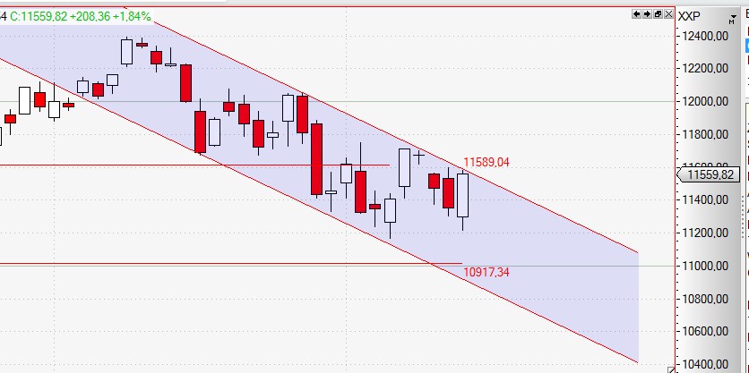 ich sehe den dax in einer übergeordneten korrekturbewegung, die ihn meiner meinung nach nahe an die 200er-GD Linie bringen wird. Sieh dir mal einen 5jahres-Chart vom Dax an, da geht die letzte bewegung kerzengerade hinauf-sowas hält nicht und korrigiert sich weg. so seh ich das -und bei knapp 11700 points muss der dax erst mal zeigen, was weiter geht. da verläuft in etwa die obere begrenzung des nunmehringen kurzfristigen downtrends.