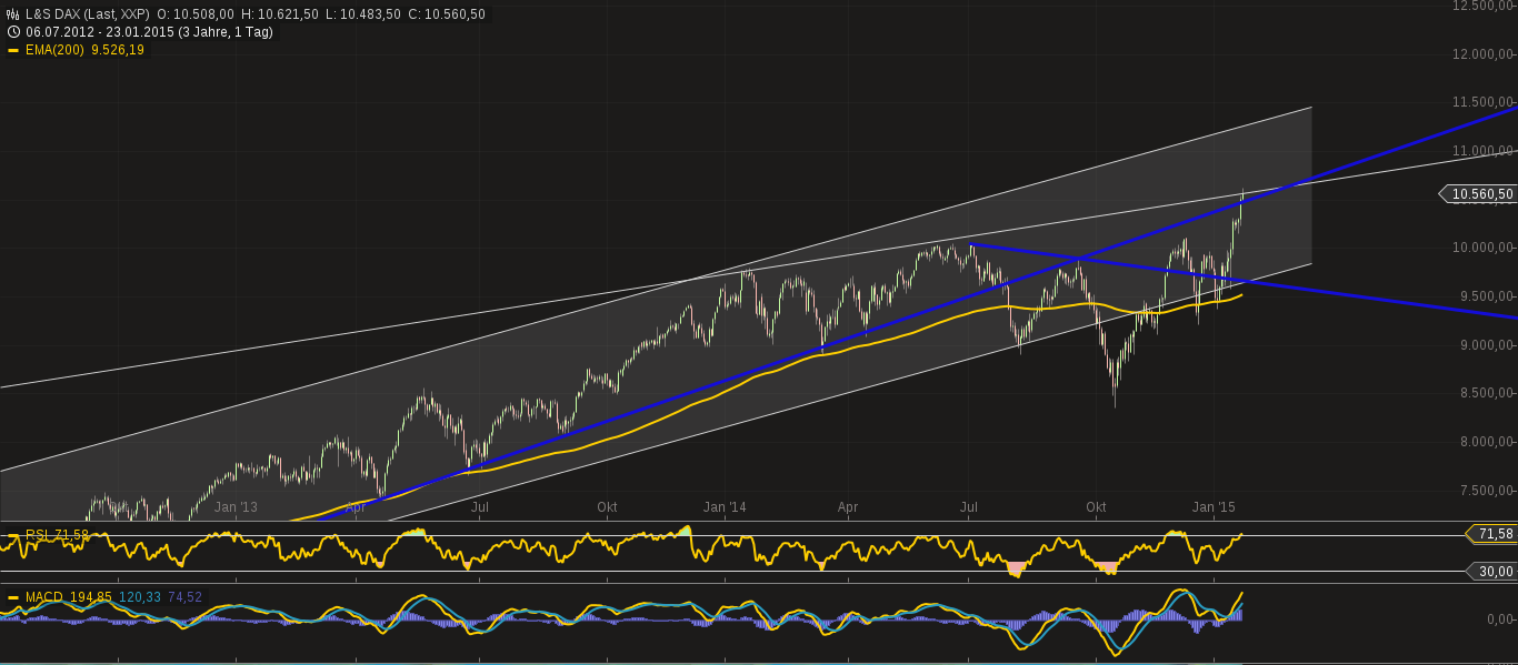 Bildlich kann man sich hier sicherlich ganz gut einen Turm aus Sektgläsern vorstellen. Die EZB kippt jetzt Sekt in das oberste Glas, welches schnell überläuft. Dadurch füllen sich auch die anderen Gläser. Und eines der Gläser weiter unten ist die Aktienbörse.