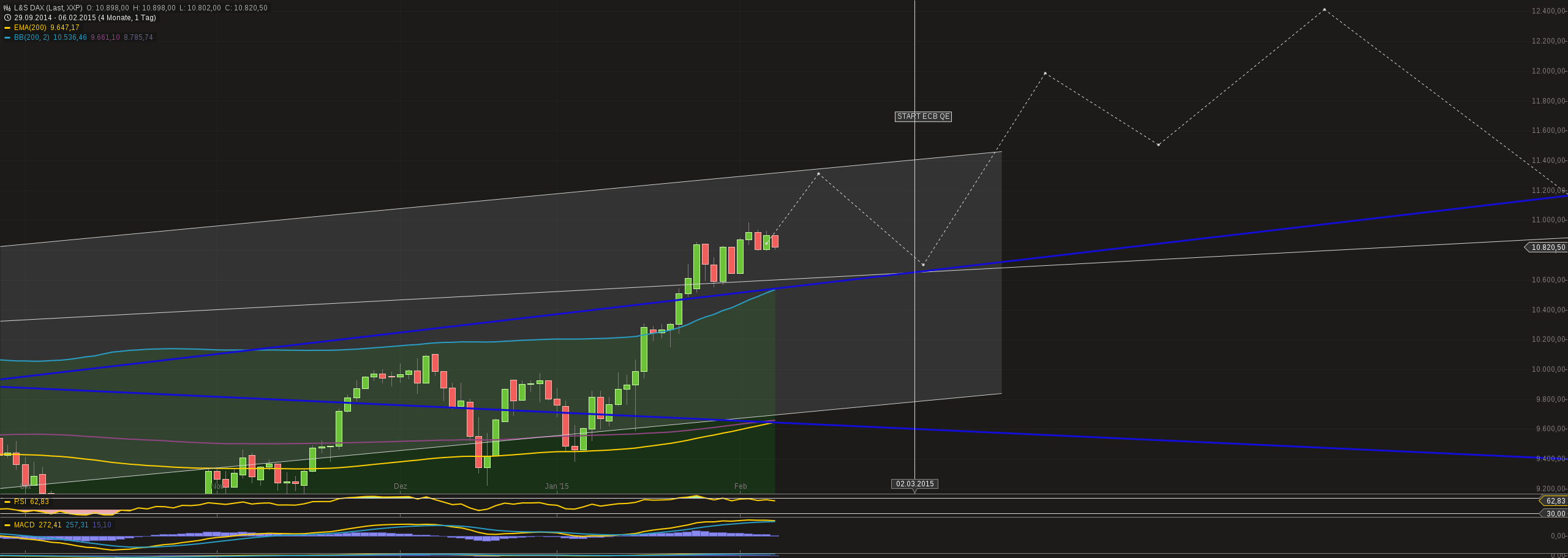 Wir sind aber noch nicht so weit. Sie erinnern sich, dass ich vor einiger Zeit geschrieben habe: Wenn der DAX die 10.000er Marke nachhaltig bricht, wird er erst einmal sofort Richtung 11.000 Punkte laufen. Das ist eine ganz normale Entwicklung und war abzusehen. Der DAX muss also mehr tun, damit die genannten Prozesse anfangen. Wenn aber die Kurse nun einfach weiter steigen, sollte man sich mit dem oben genannten Szenario auseinandersetzen. Einfach aus dem Grund, damit eine solche Rally nicht vollkommen an einem vorbeirennt und man keinen Einstieg findet, weil die Kurse einem ständig weglaufen."
