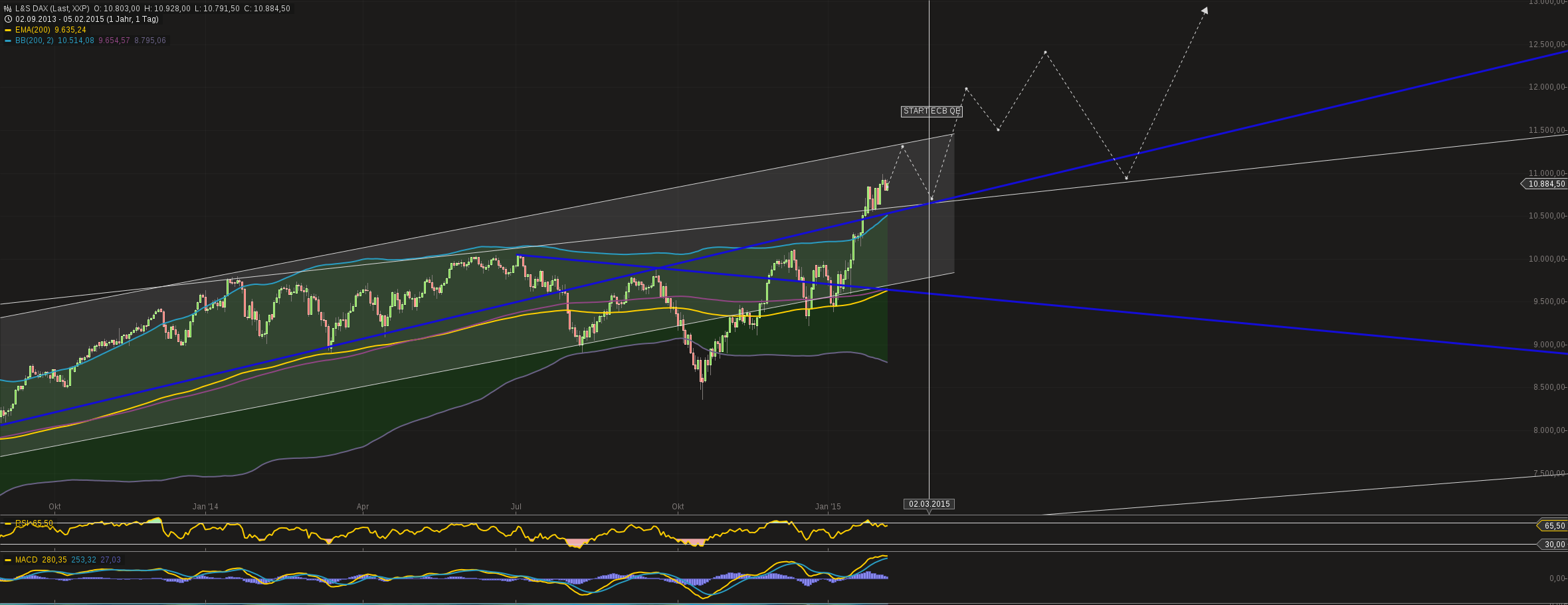 Wenn das geschieht, würde der DAX immer weiter und weiter steigen. Und damit könnte ein weiterer unterstützender Faktor hinzukommen. Viele Menschen in Deutschland und Europa suchen verzweifelt nach Anlagemöglichkeiten. Wie eingangs geschrieben, in weniger als einem Monat hat der DAX mehr Rendite erwirtschaftet, als ein Sparbuch in zehn Jahren. Wenn sich diese Tendenz noch verstärkten sollte, wird irgendwann auch die Masse der Anleger über die Gier wieder in den Markt gezwungen. Allein schon, weil die Medien dann dieses Thema immer mehr aufgreifen werden. Ebenfalls unterstützend würde sich dann auswirken, dass der DAX doch all den Risiken trotzt und immer weiter steigt. Das dürfte auch für den an sich höchst ängstlichen deutschen Anleger ein gewisses Maß an Sicherheit bringen.