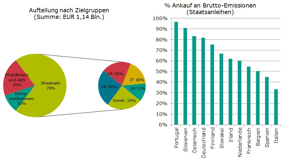 deutschland erhält 25 % von 70 % der 1,14 billionen. von den 1,14 billionen fließen 802,2 milliarden in staatsanleihekäufe. 229 mrd in asset-backed securities und covered bonds. 109 milliarden sind europäische institutionen.