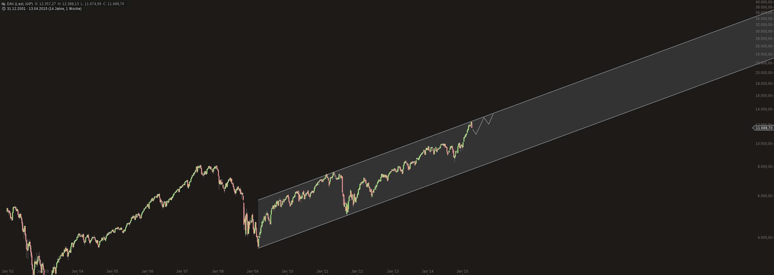 Ich rechne mit einem heftigen Rebound gleich am Montag zunächst bis 12.000, deshalb habe ich meine Stop Buys oberhalb von 11.800 gesetzt. QE läuft weiter, zudem werden die Großen, die in den letzten zwei Tagen Gewinne mitgenommen haben, sehr schnell nervös, um bloß nicht den Anstieg nach der Korrektur zu verpassen. Die massive Menge an Geld muss irgendwo hin. Ab Mitte der Woche werden Unternehmenszahlen und Ausblicke präsentiert. Sollten diese noch in Ordnung sein, geht's weiter bis auf 12.500 und alle wundern sich warum. Bin ich ein Optimist? Nein, eher ein Realist. Es sei denn, Draghi sagt plötzlich, QE bringt nichts und wird vorzeitig eingestellt. Dann haben wir aber schnell Kurse im vierstelligen Bereich. Diese will keiner von den Großen so schnell sehen. Von einer Geldblase würde ich erst bei Kursen um 15.000 sprechen, wenn diese bereits heute erreicht worden wären. Dann würden weder die KGV's der Unternehmen noch die Konjunkturaussichten zu den Kursen passen. Bei den momentanen Kurse sehe ich zwar schon recht hohe Bewertung, aber keineswegs eine Geldblase. Daher sehe ich einfach kein Potenzial für Rücksetzer.