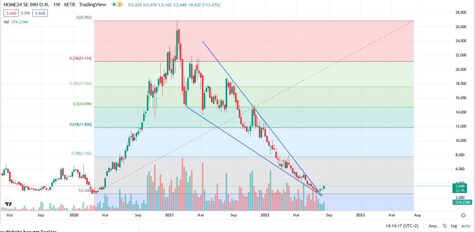 Man kann viel rechnen und befürchten, man muss aber mal klar sagen, dass die Bewertung aktuell kein vernünftiges Chance Risiko Verhältnis zeigt, sondern eigentlich nur Risiko. Und Rendite kommt von Risiko. Damit ist klar, glaube ich langfristig an diese Unternehmensidee, dann habe ich hier die Chance auf hohe Rendite. Oder aber ich bin extrem skeptisch, nun dann brauche ich nun auch nicht mehr skeptisch, dann war ich hoffentlich bis hier hin short, denn noch weiter macht kaum Sinn, da Home24 nicht dieses und vermutlich auch nicht nächstes Jahr Pleite geht. Und dann habe ich bis hier her, sehr richtig gelegen und weiter macht auch aus der Shortsicht, vom Chance Risiko Profil, kaum mehr Sinn.
