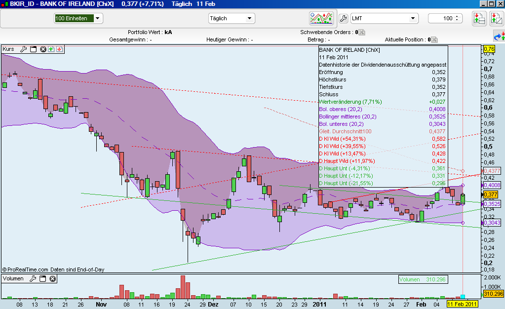 Die nächsten Ergebnis-Ankündigung der Bank of Ireland werden am 24. März 2011 erwartet. Q4 2010 und Jahresbericht 2010 Wachstumerwartungen sind auch positv, sowohl kurzfristig als auch langfristig. Also nicht gleich wieder die Nerven verlieren. Schlusskurs Freitag war bei 0,381 € , nur nachbörslich wurde der Kurs noch mal hochgezogen. Heute ist also fast gar nichts passiert. Leider ist es für die Investierten immer noch ein Geduldspiel