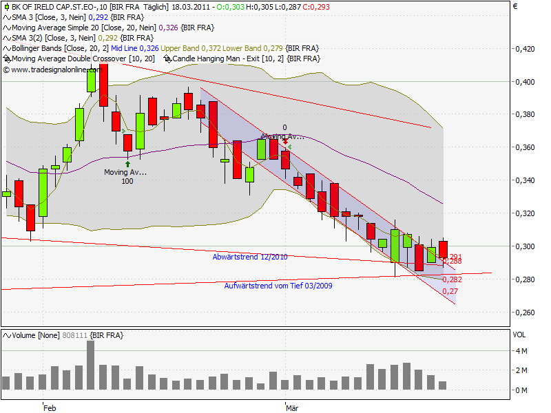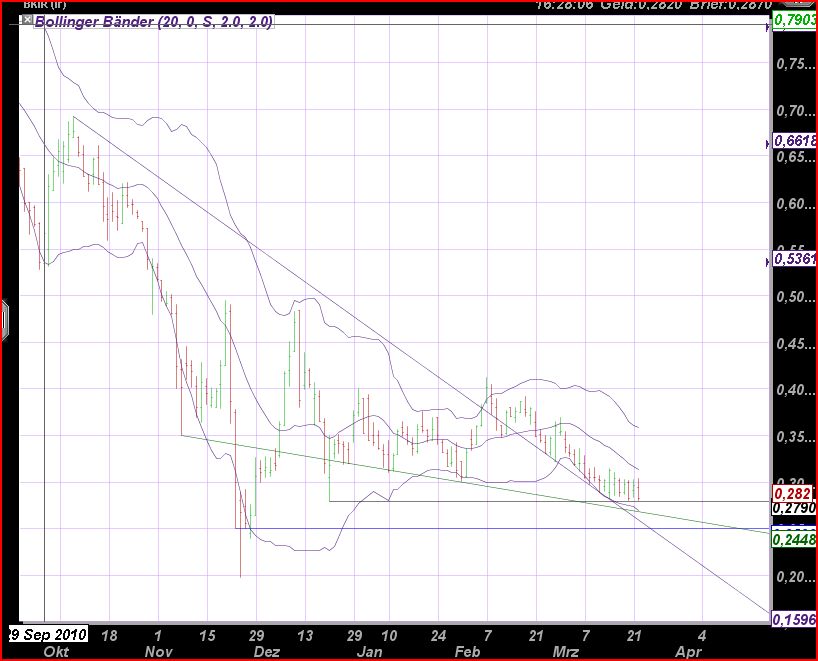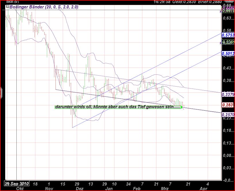 ich finds gut, dass du dir Gedanken machst zu unsere BoI und auch ich hoffe sehr, dass es bald merklich aufwärts geht, aber Chartanalyse bringt hier echt nichts. Das Gedümpel wird kein Ende finden, bis neue Informationen den Markt speisen! Wie brokerdavid absolut richtig bemerkt hat, wird diese heiß erwartete Information am Donnerstag kommen... Und nur die Information wird dem Kurs einen entscheidenden Impuls geben können. Ein hoch auf 0,35 Cent kann nur durch eine starke Erhöhung der Nachfrage nach BoI Aktien erzielt werden. Zur Zeit sehe ich keinen Grund, wieso sich diese Erhöhung "aus dem Nichts" einstellen sollte. Dafür gibt es einfach keinen kausalen Grund, egal wie schön deine Trendkanäle aussehen :)