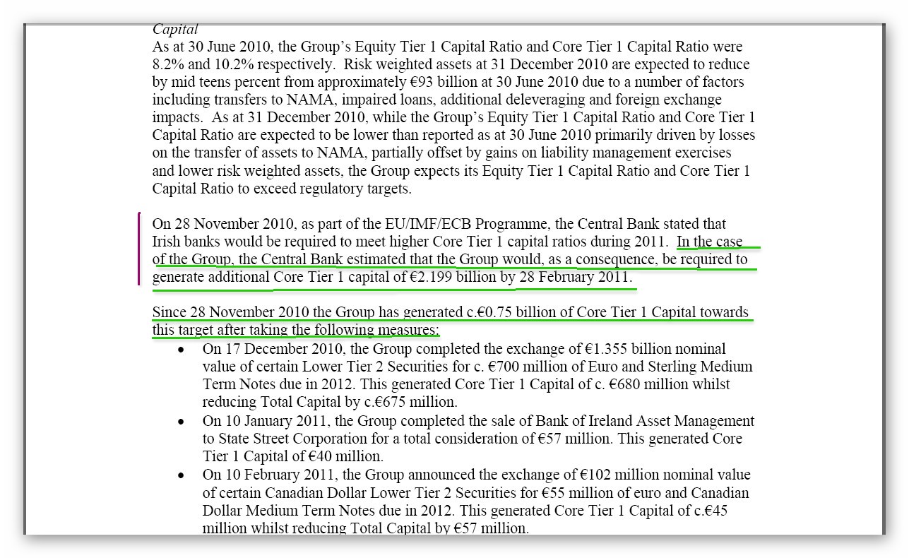 an dieser stelle darf ich (siehe grafik) die stellungnahme von der BOI anlässlich der dividendenzahlung von 214 mio. an den irischen staatsfonds (!!! ) einfügen. nach dieser stellungnahme konnte man davon ausgehen, dass die BOI noch rd. 1,4 mrd. € von der angedachten 2,4 mrd. KE benötigt, um die EU-kapitalanforderungen zu erfüllen.