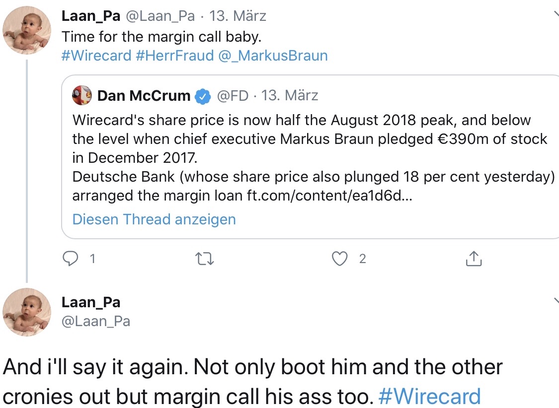 Meiner Meinung nach setzen die Shortseller auf einen Margin Call von Braun, damit dieser seine als Sicherheit hinterlegte Aktien an die Deutsche Bank geben muss - und diese die dann sofort verkauft. Daher ist der geforderte Rauswurf von Braun auch mit diesem Hintergrund zu sehen.