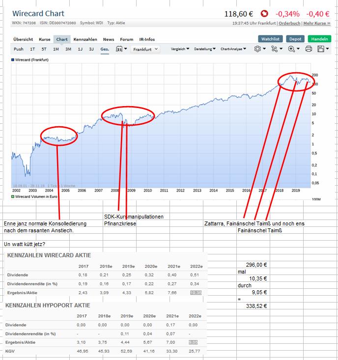 Ein Beispiel: Jemanden solange medial in die Pfanne hauen, bis er endlich nachgibt, einen Kommunikationschef einstellt und einen Vorstand für Vertrieb/Marketing einsetzt, der dann das Marketingbudget erhöht. Wie gesagt, dies ist nur ein Beispiel! Für den eigentlichen Unternehmenserfolg wären diese Positionen natürlich entbehrlich, wie das Zahlenwerk, die Neukundenabschlüsse und das Investoreninteresse an Wirecard, u.a. von Softbank und DWS, belegen. Dass Kurs und Fundamentaldaten eine Zeit lang voneinander losgelöst verlaufen, ist ja normal. Und dass die Wirecard-Aktie einen wahren Run in 2017 und 2018 hinlegte, ist für DAX-Neulinge und vor allem durch das Covern hoher Short-Positionen wie im Anschluss an Zatarra ebenfalls völlig normal.