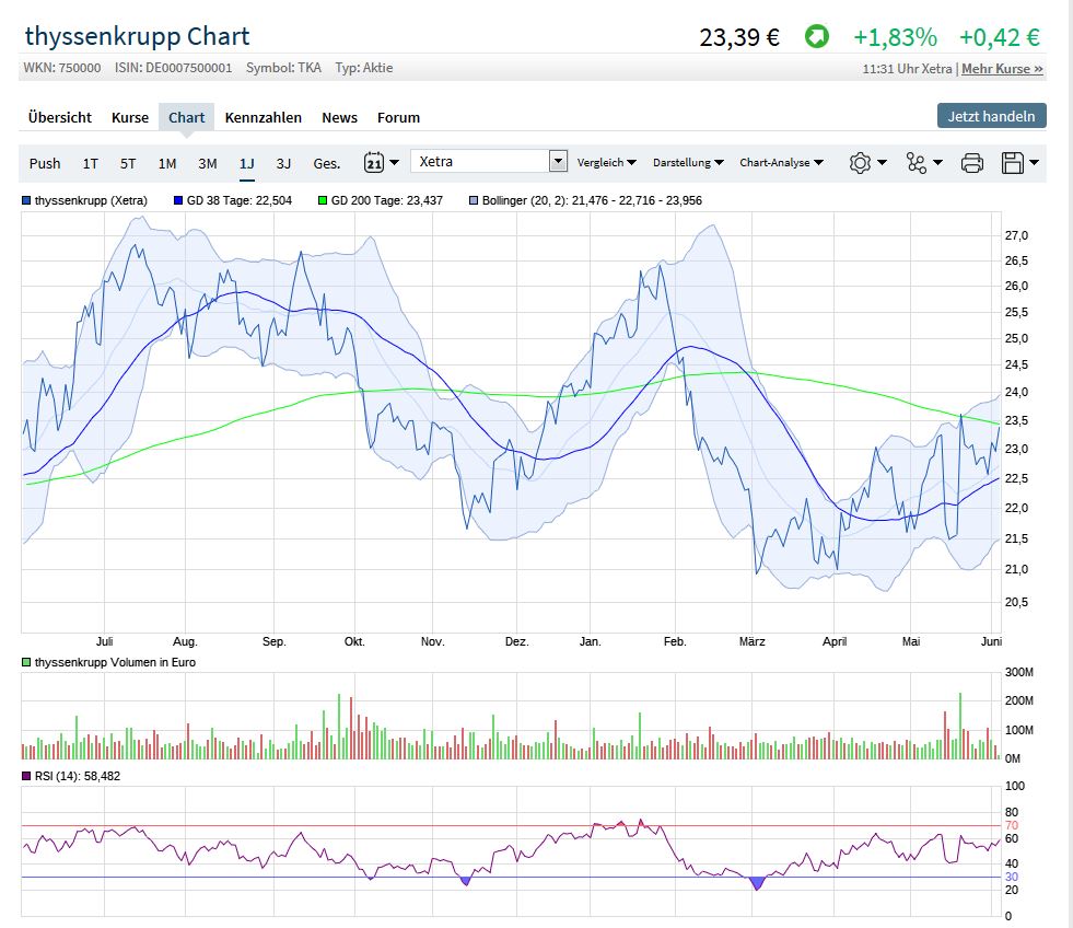 Bin gerade meine Excel-Tabelle durchgegangen und hab mal die aktuellen Zahlen von TK eingefügt. Was raus kommt, ist dramatisch und auch ein Grund, warum ich heute Thyssen verkauft habe: Mehr als ein Erinnerungswert von 1 EUR steht nämlich bei meinem Kursziel nicht drin.